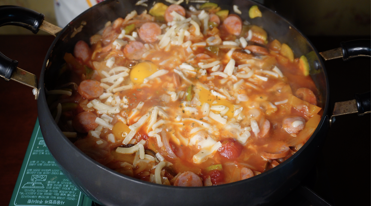 위에 모짜렐라 치즈를 뿌리고 뚜껑을 덮어 약불에서 5분 정도 익혀줍니다.