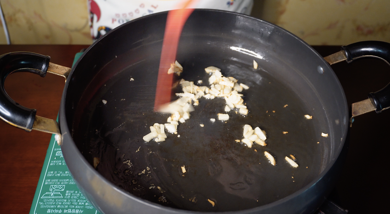 팬에 식용유를 두르고 다진 마늘을 넣어 향을 내줍니다.