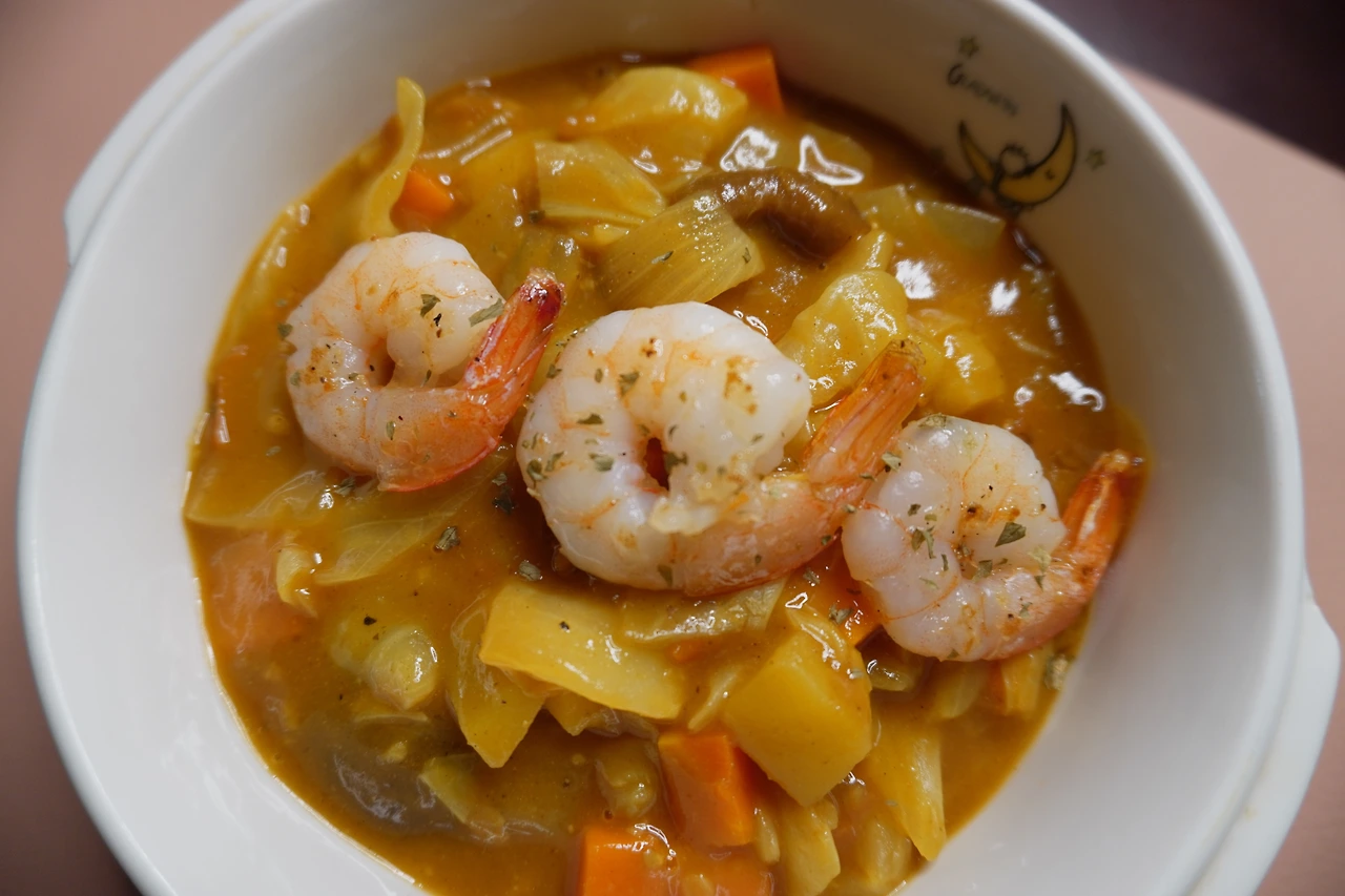 밥 위에 카레를 듬뿍 올리고 구운 새우를 올리면 완성!