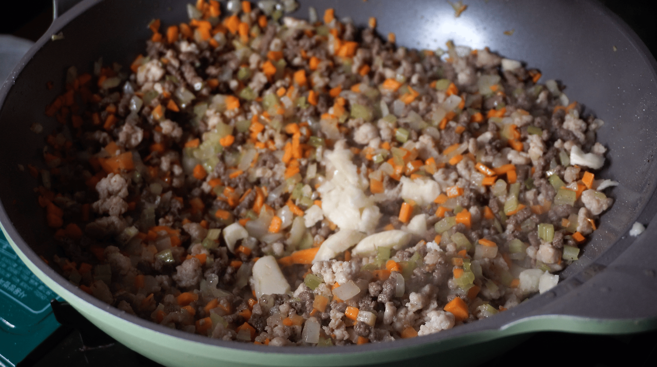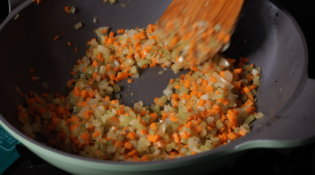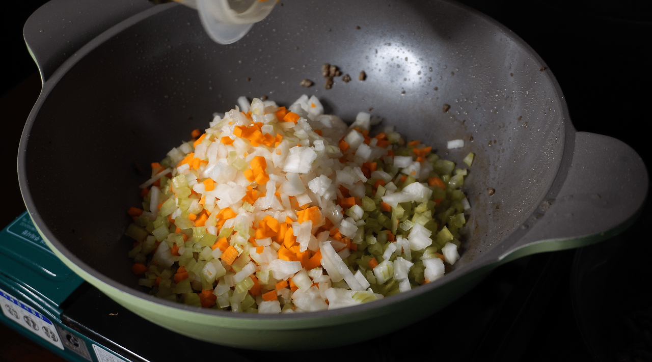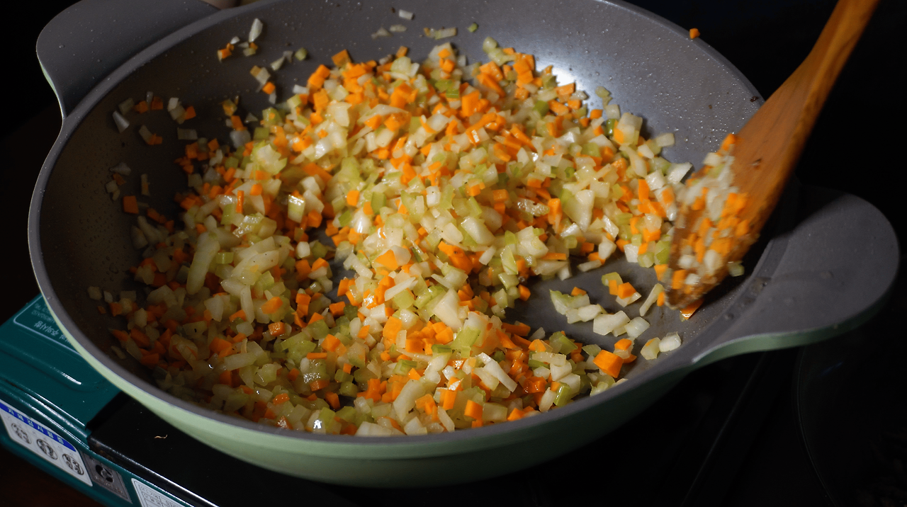 양파, 당근, 샐러리를 잘게 다져서 올리브오일에 볶아 단맛과 향을 끌어내는 과정입니다.