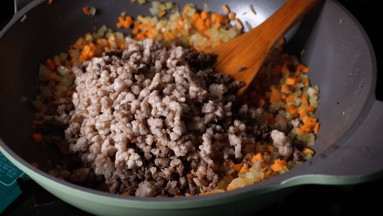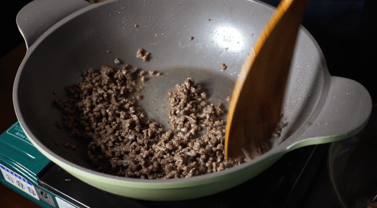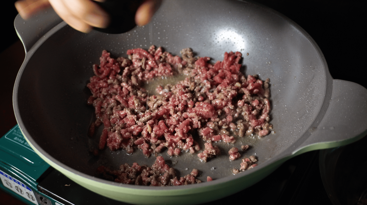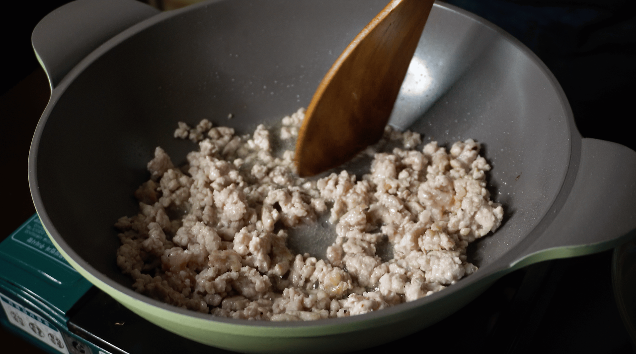 달군 팬에 올리브 오일을 두르고, 다진 돼지고기를 먼저 넣어 센 불에서 볶아주세요.
