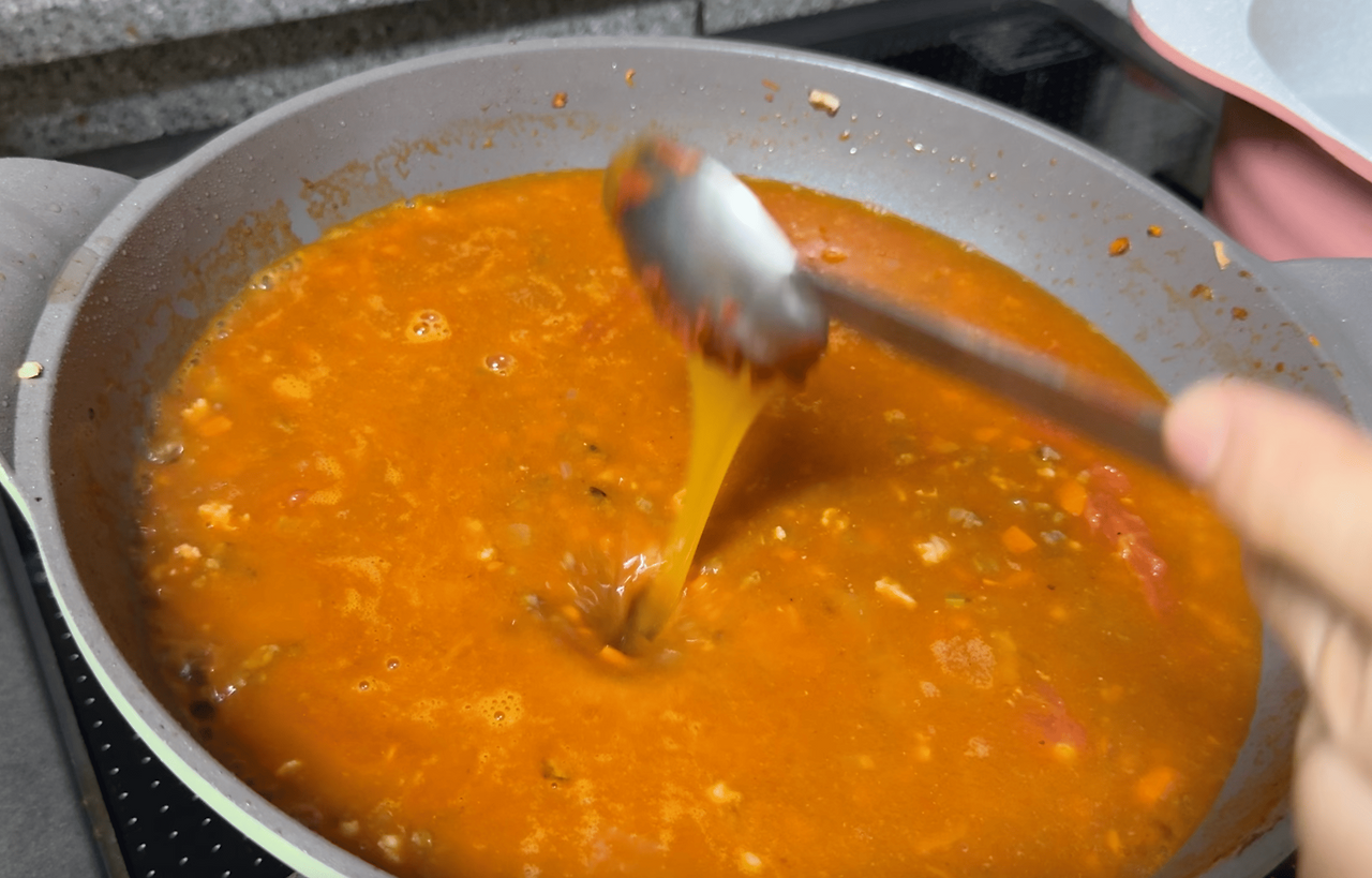 물은 한 번에 모두 넣지 말고, 소스가 졸아들 때 두 번 정도로 나누어 넣어주세요.