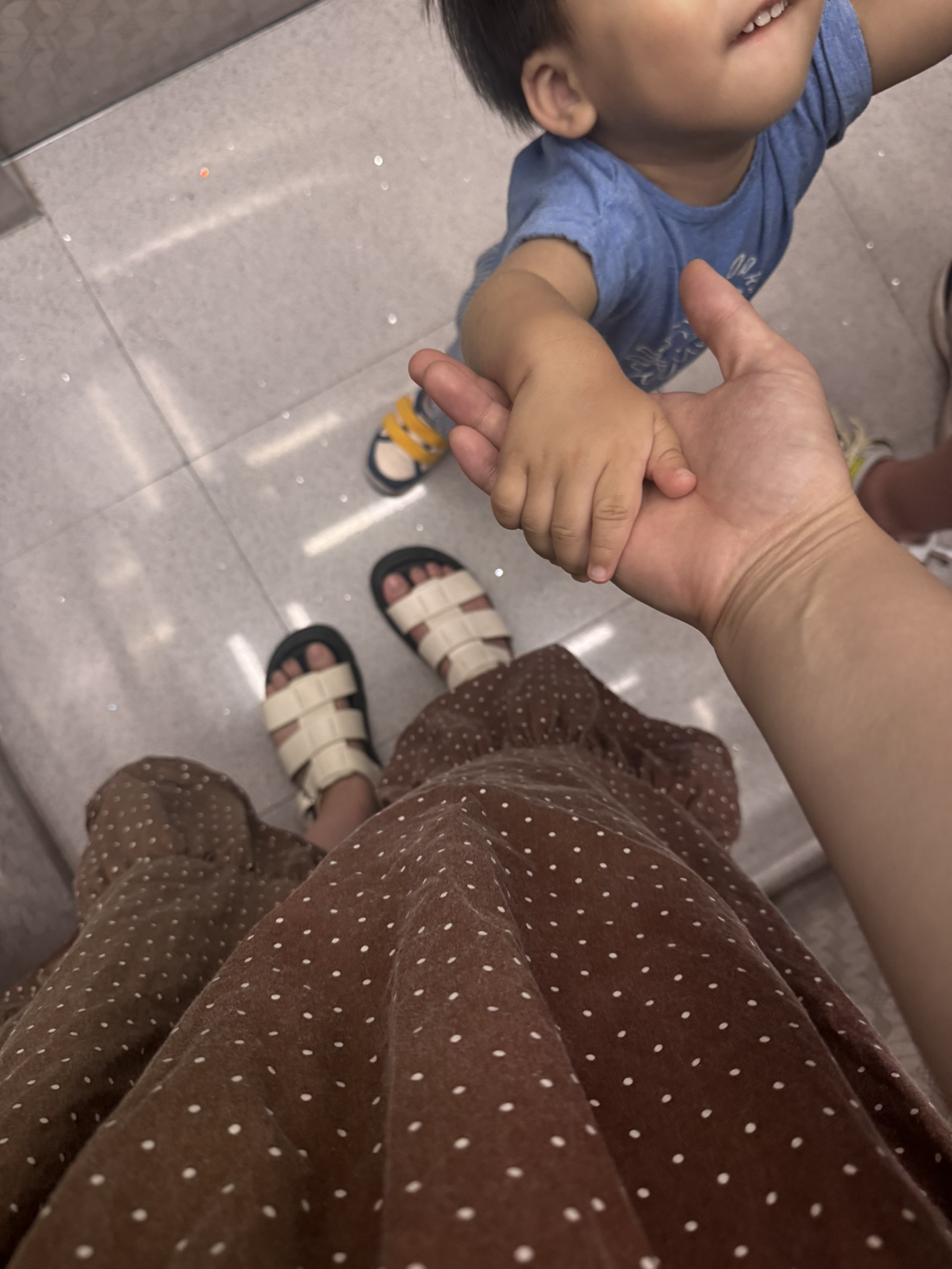 오늘 아침, 나가는 길에 엘리베이터를 타고 내려가고 있었다. 내려가던 중 6층에서 멈췄고, 뽁뽁이 신발을 신고 아장아장 걷는 아기가 할아버지 손을 꼭 잡고 엘리베이터에 올라탔다.