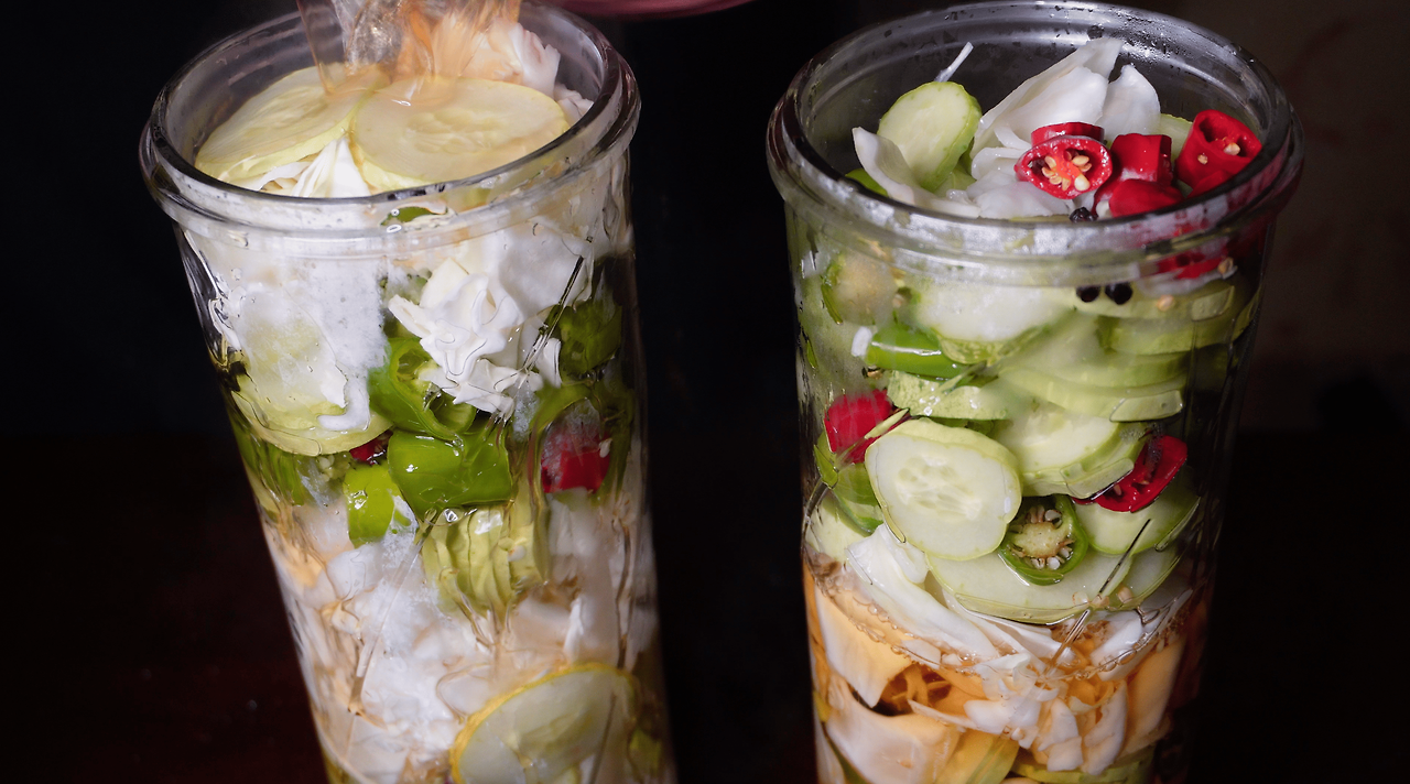 뜨거운 피클 물을 유리병에 부어줍니다.