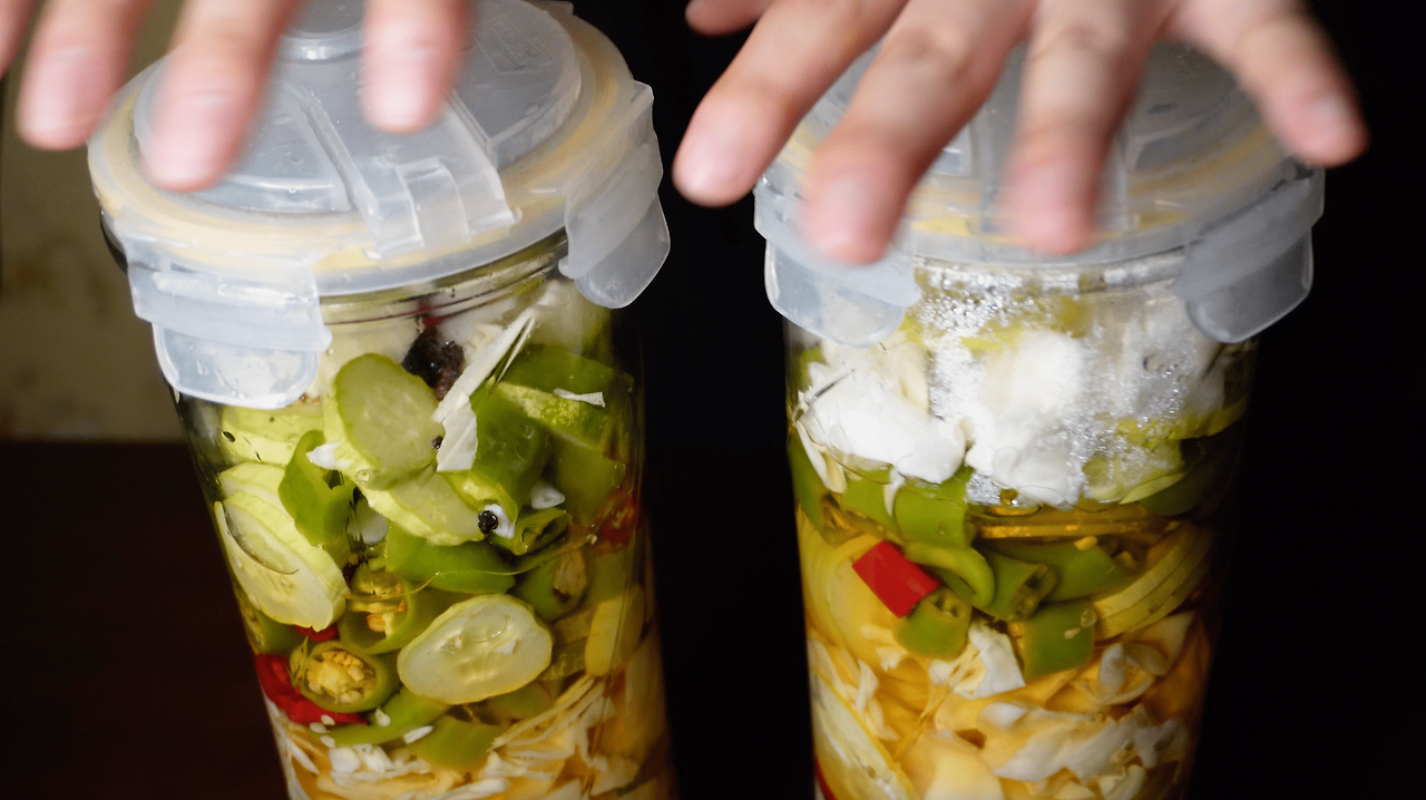 *피클 통을 뒤집어 두면, 간이 야채 구석구석까지 잘 스며들어요.