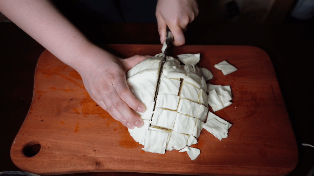양배추는 사각형 모양으로 썰어, 깨끗이 물에 씻어주세요.