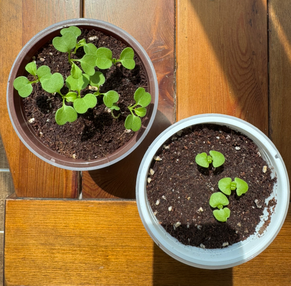 루꼴라와 바질에서 '본잎'이 보이기 시작한다.
