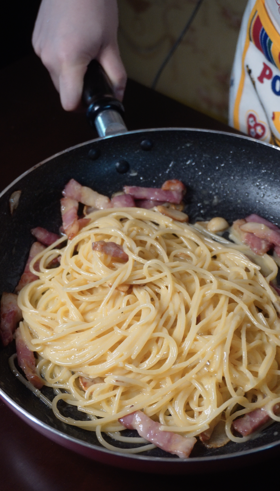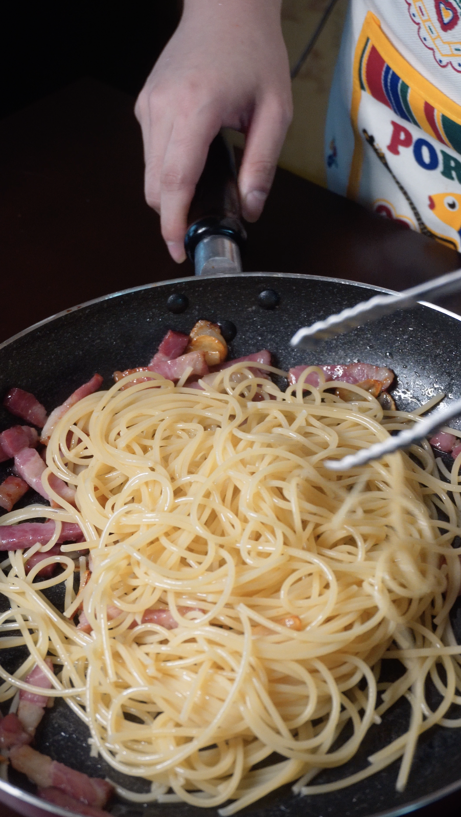 삶은 면을 마늘과 베이컨을 조리한 팬에 넣고 잘 섞어줍니다. (이때 불은 끈 상태입니다.)