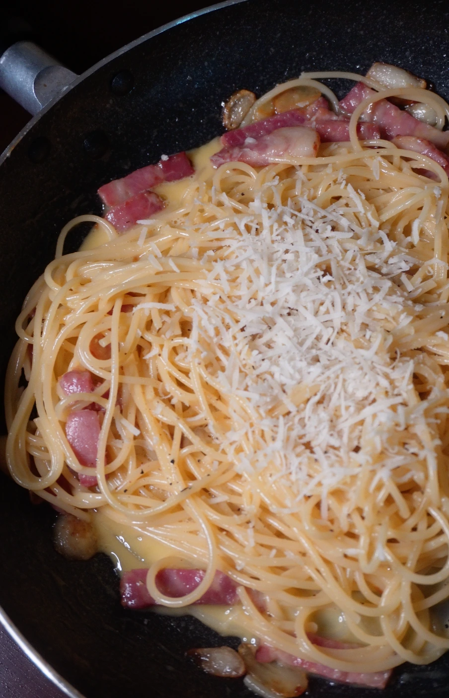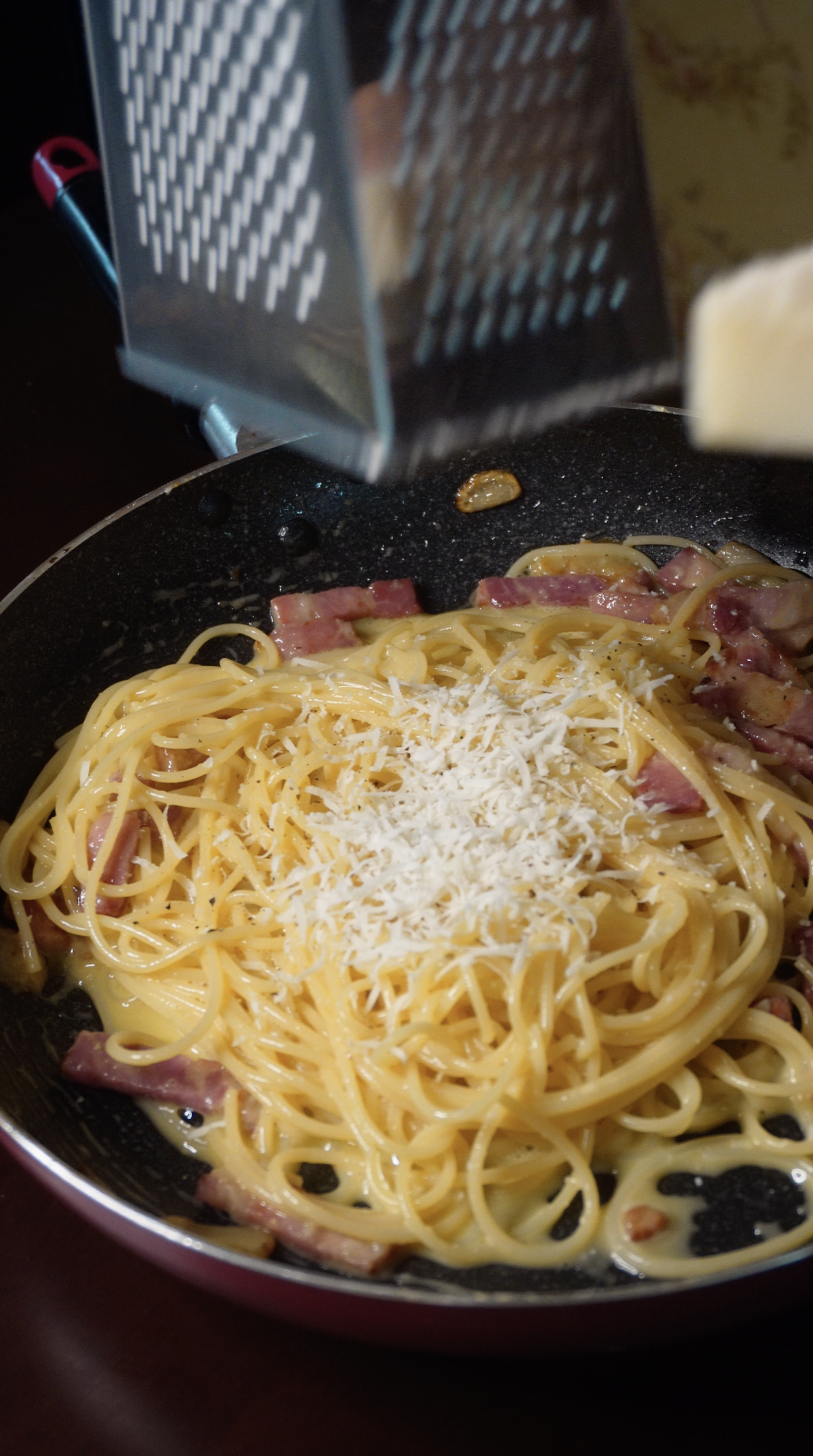원래 정통 이탈리아식 까르보나라는 관찰레(Guanciale, 이탈리아식 베이컨), 날달걀, 치즈로 만든 소스로 맛을 내는 파스타입니다.