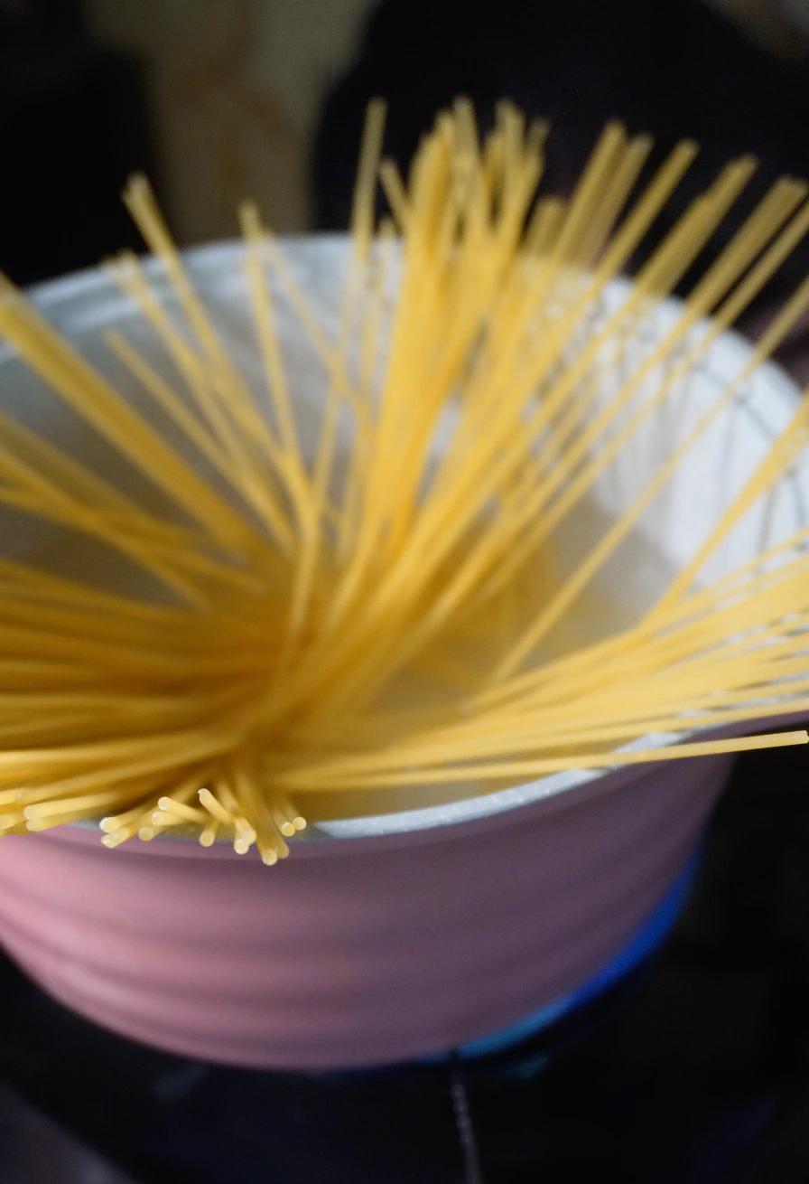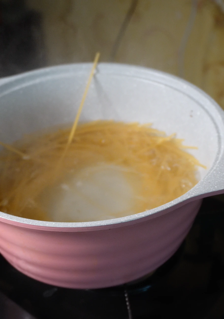 끓는 물에 소금 한 큰 술을 넣고 파스타 면을 삶아 줍니다.