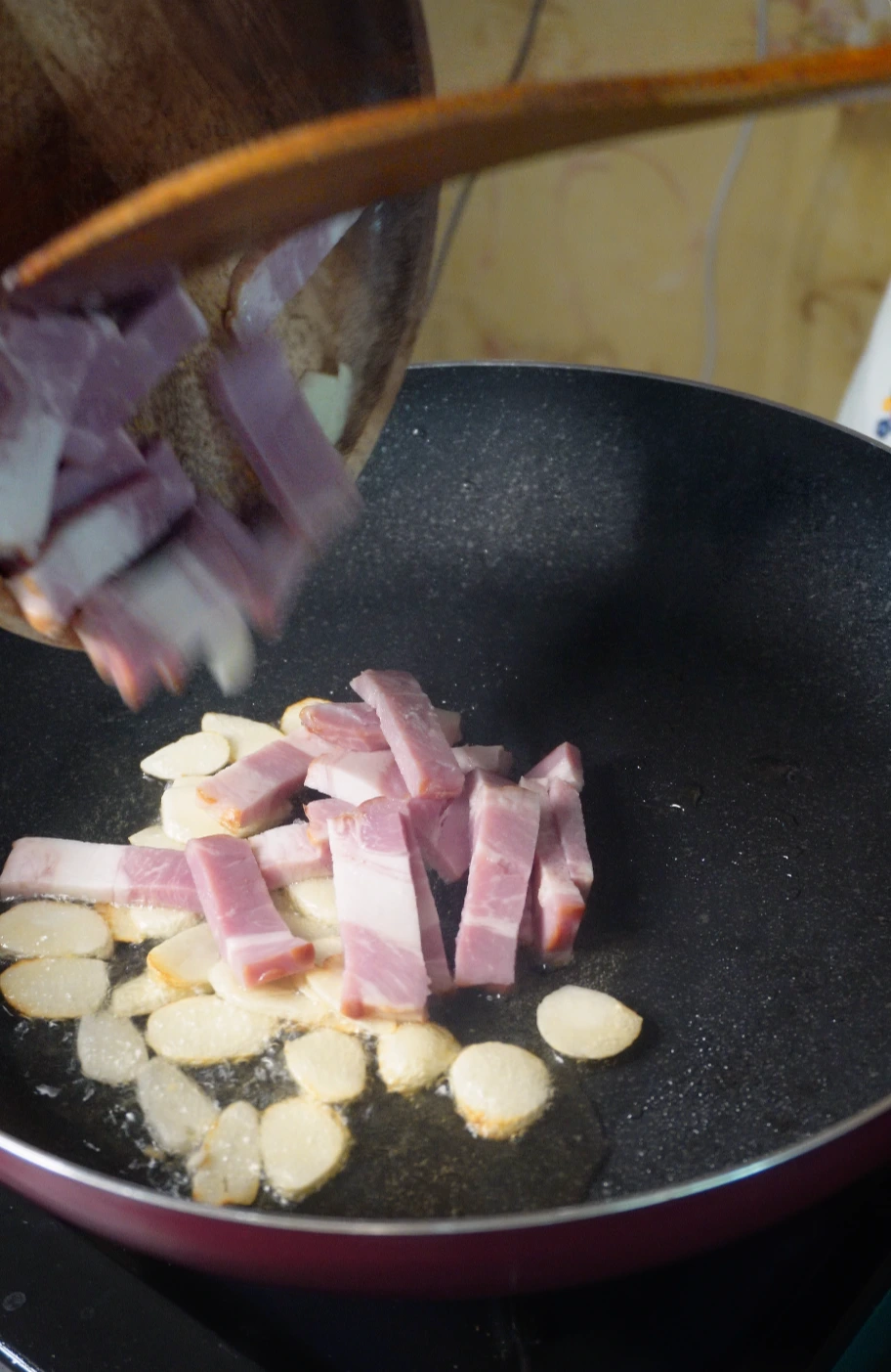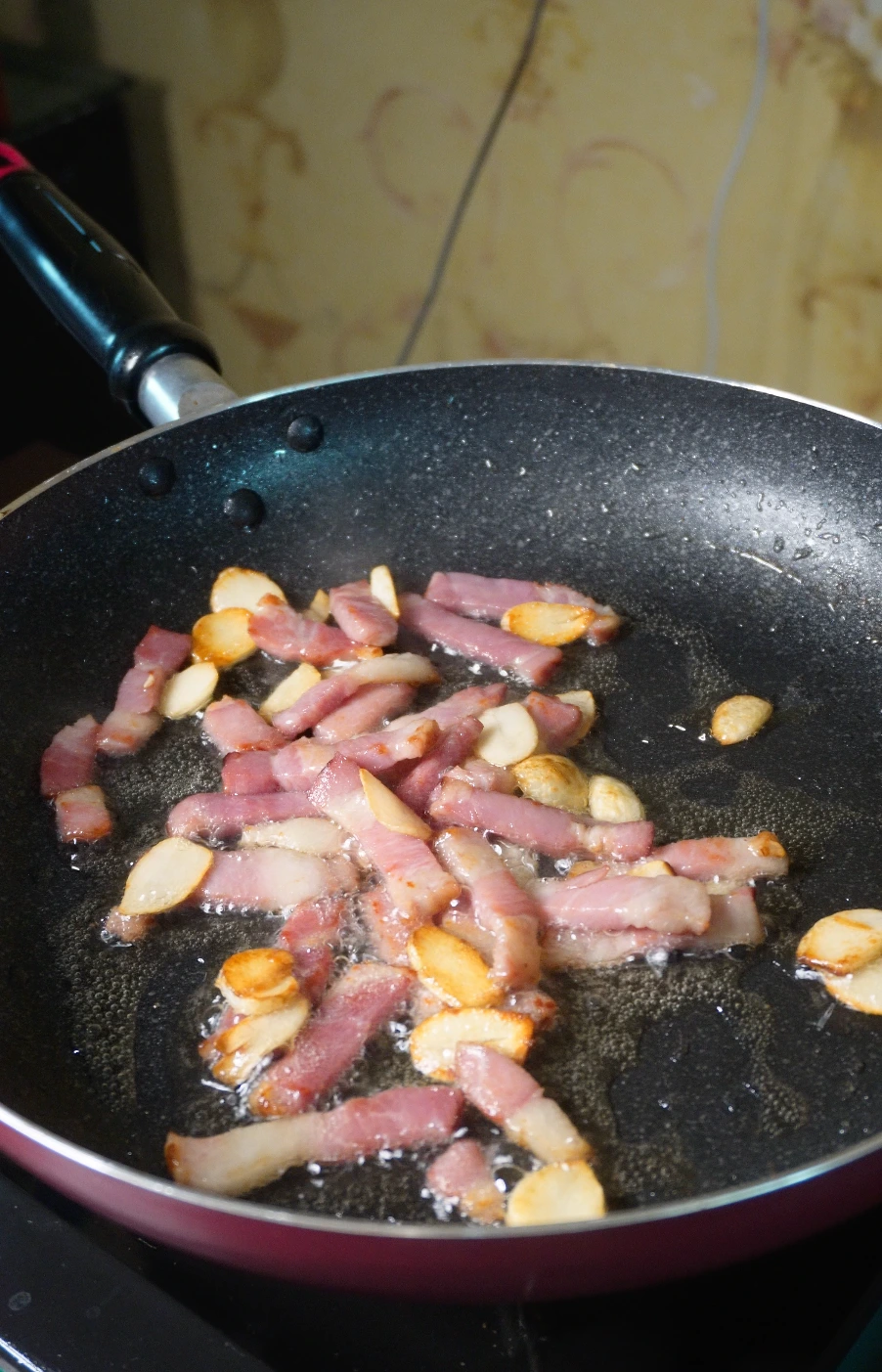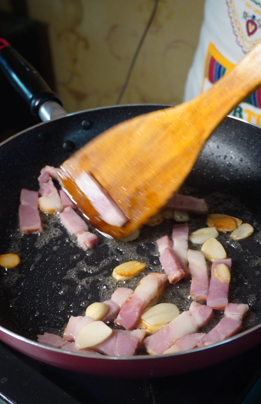 올리브유에 마늘을 살살 볶아 향을 올려준 뒤, 노릇해지면 베이컨을 넣고 같이 구워주세요.