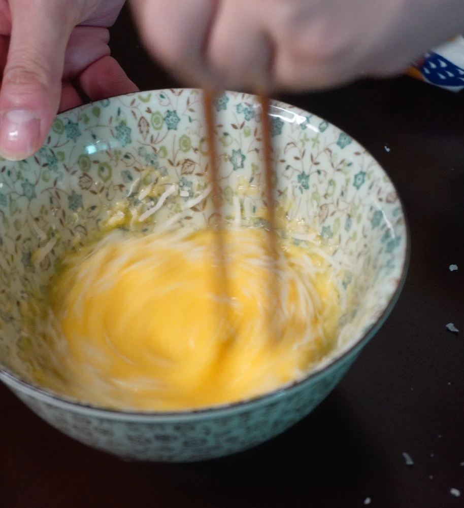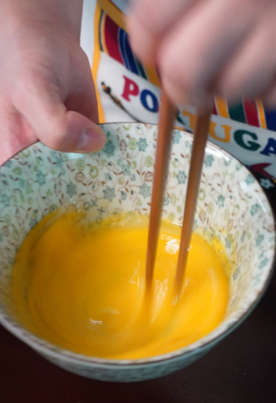 팬이 조금 식어 따뜻한 정도가 되면, 만들어둔 달걀 소스를 넣고 섞어주세요.