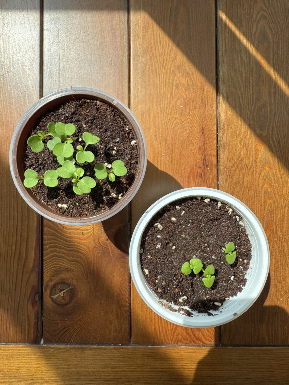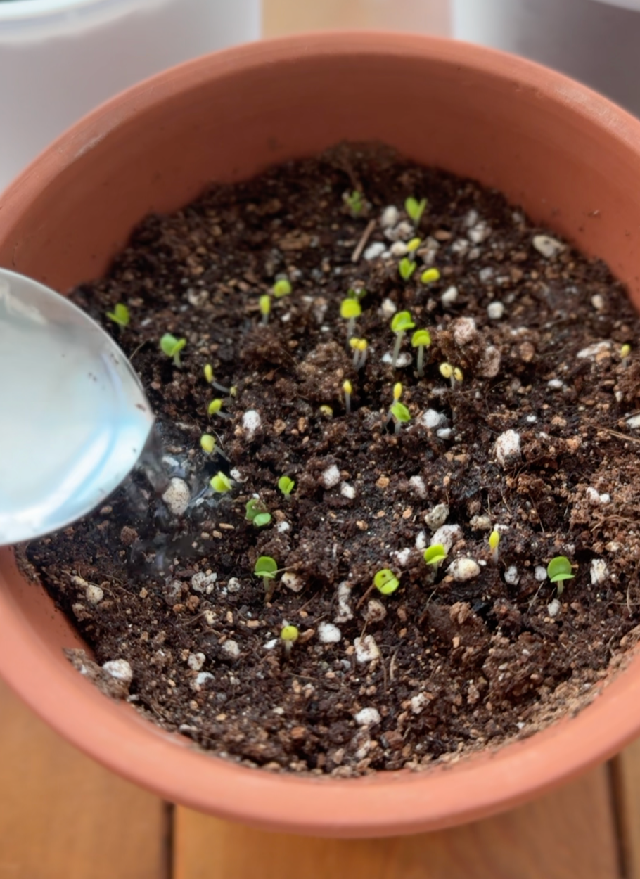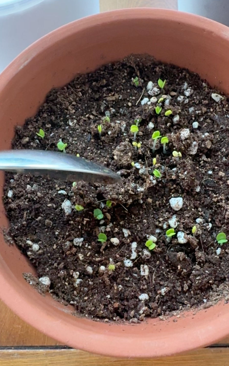 신기하게도, 평평하던 흙바닥이 살짝 부풀어 올랐다. 조심스레 들춰보니 그 바로 아래에서 작은 새싹이 힘껏 머리를 내밀며 흙을 밀어내고 있었다. 나는 숟가락으로 흙을 살짝 걷어주며, 새싹들이 올라올 수 있도록 했다.