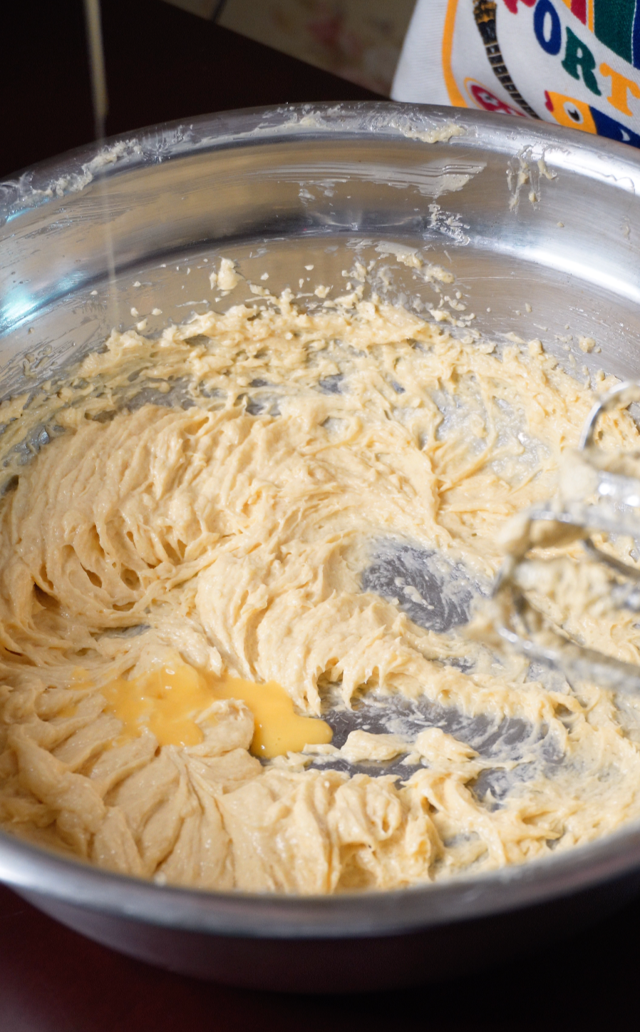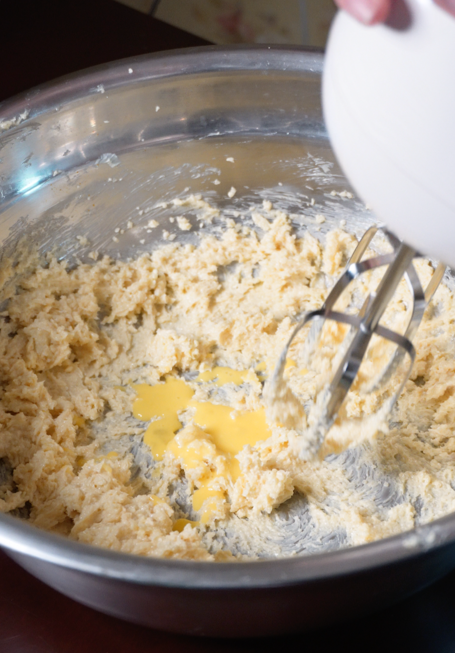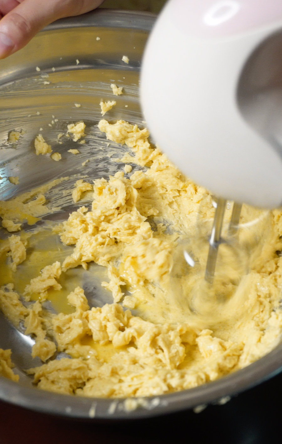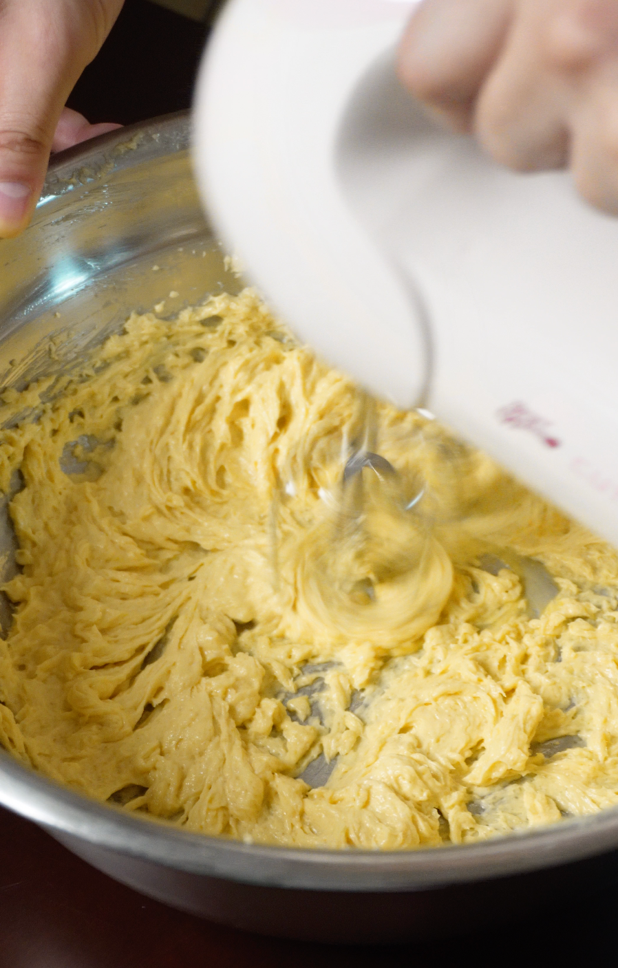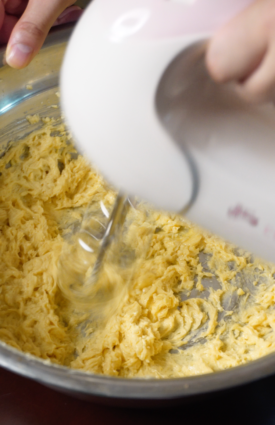 크림화된 반죽에 계란물을 여러 번에 나누어 넣고 휘핑해 주세요.