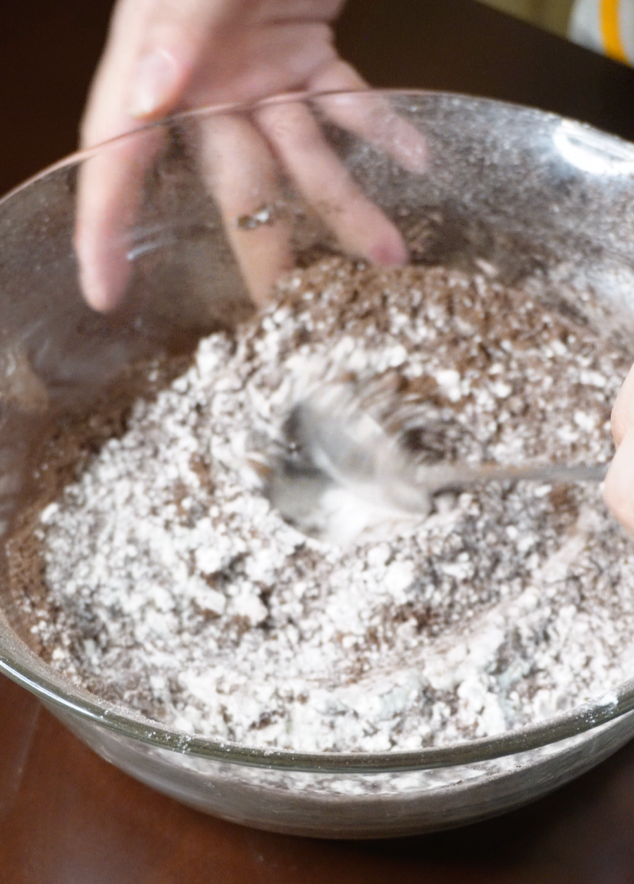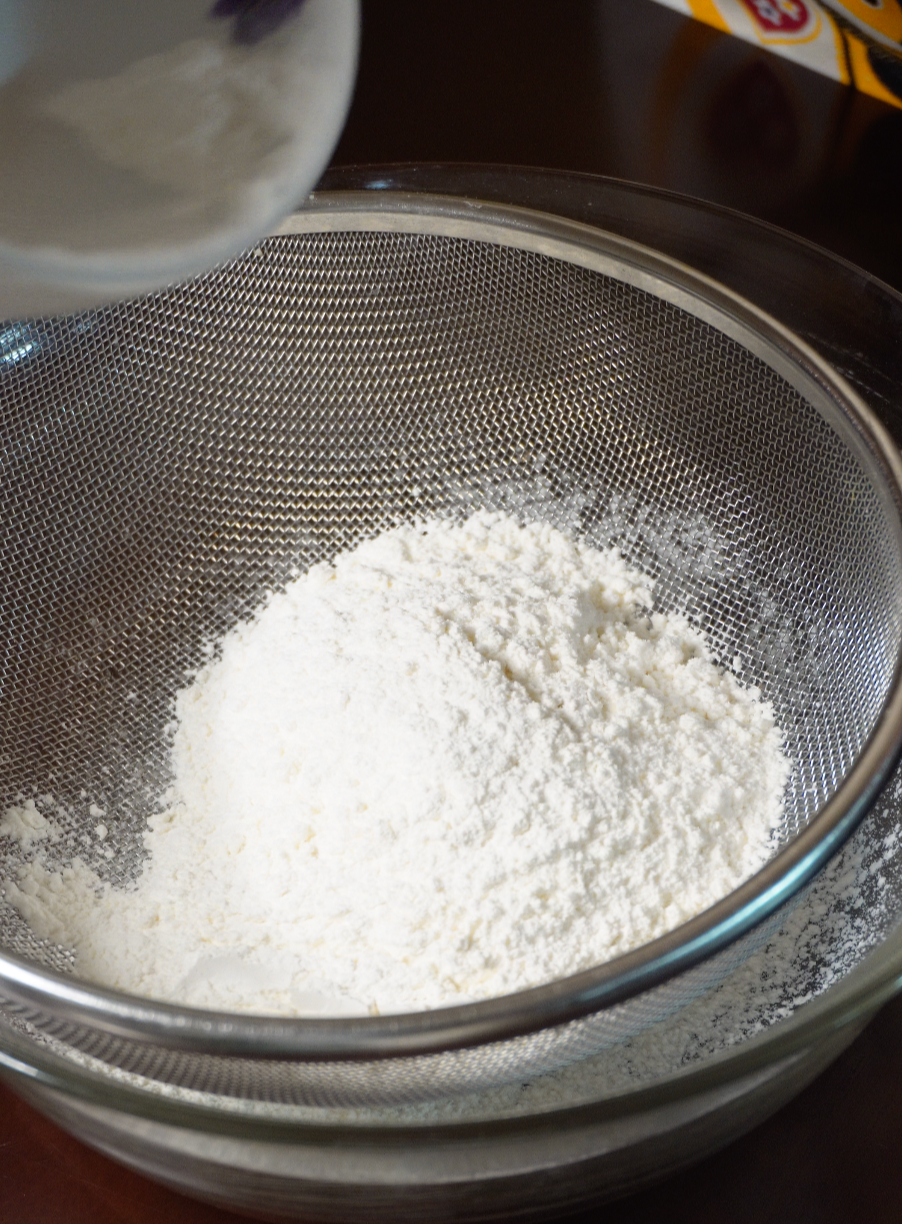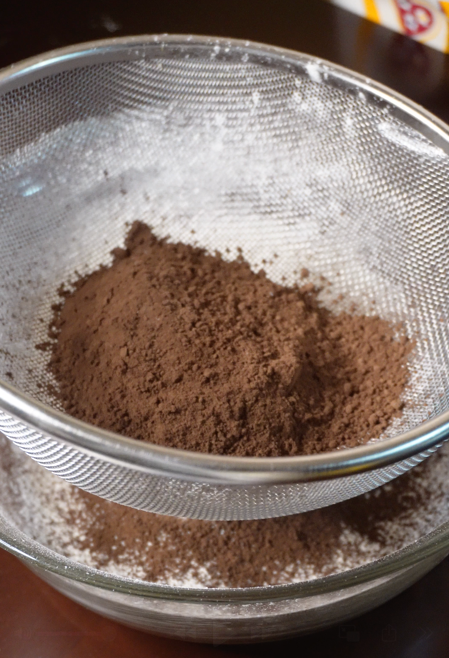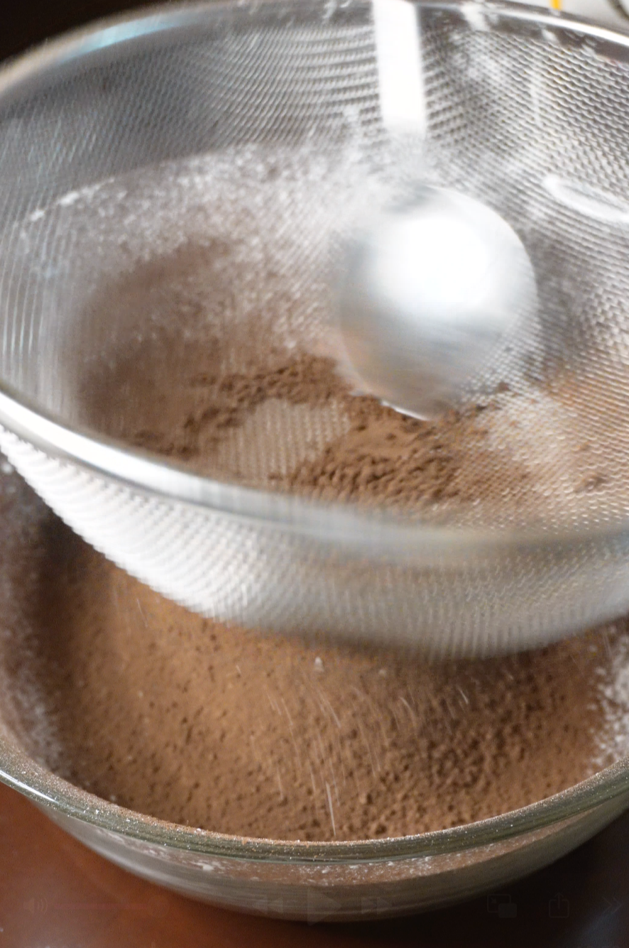 가루류를 체에 쳐서 준비합니다. (박력분, 코코아파우더, 베이킹소다, 소금)