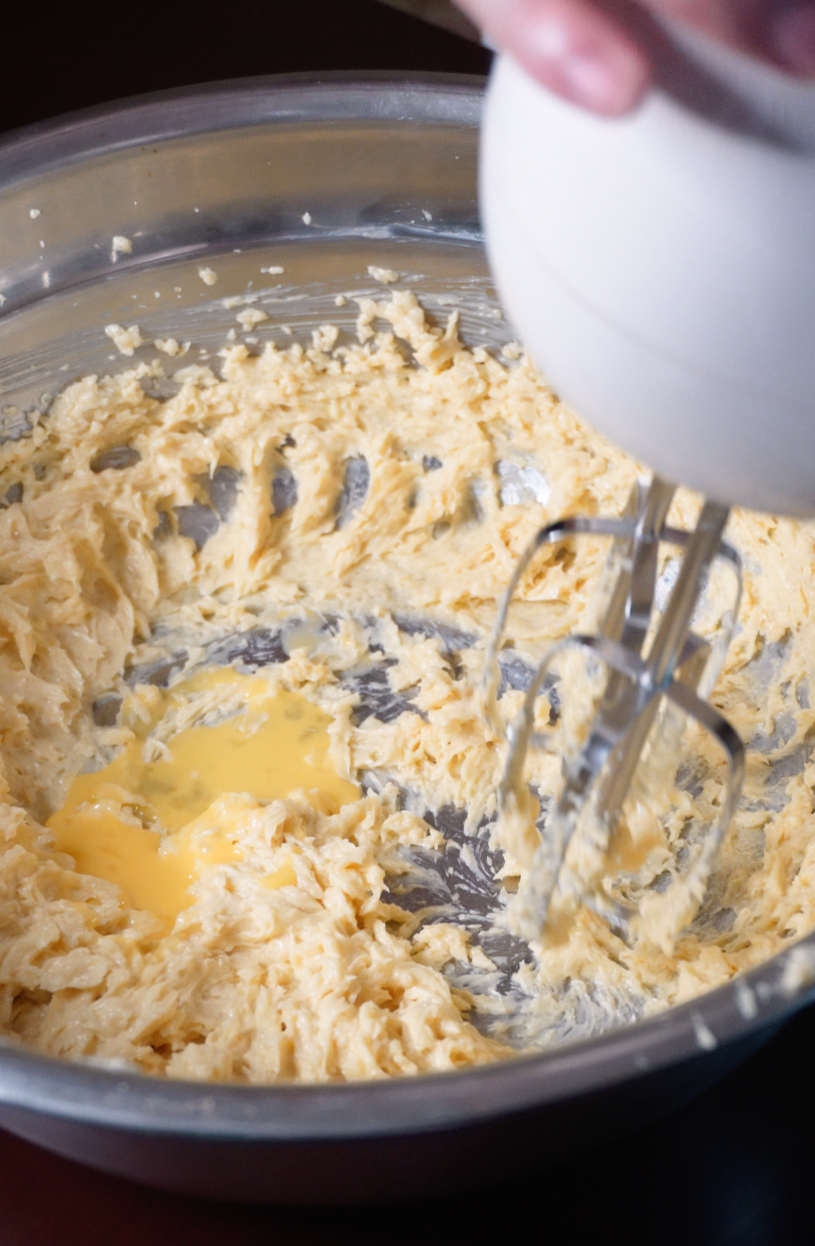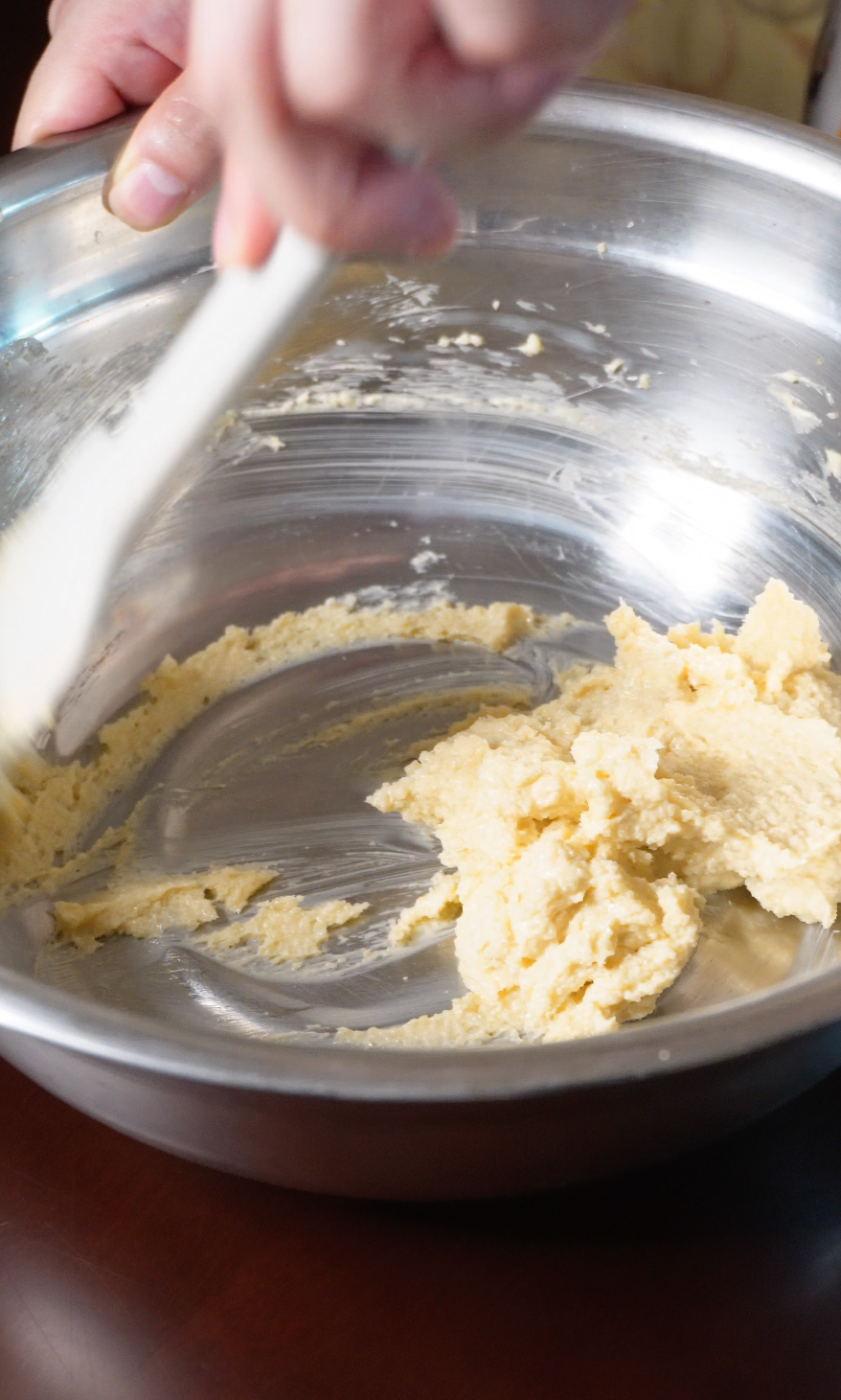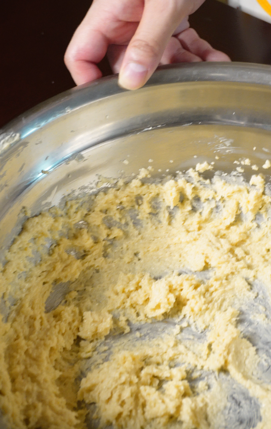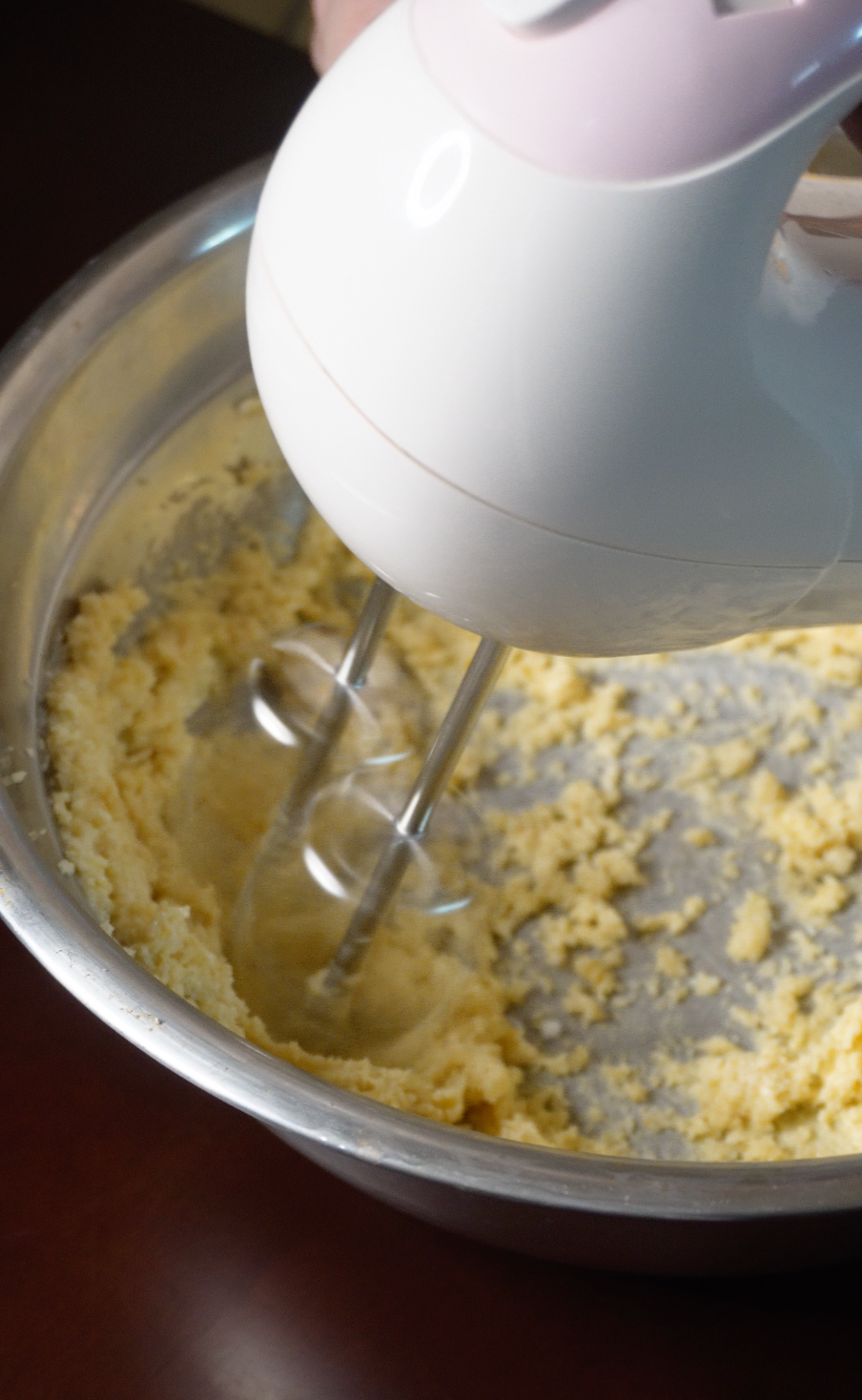 버터에 설탕을 넣고 충분히 섞어 공기를 넣어주는 작업
