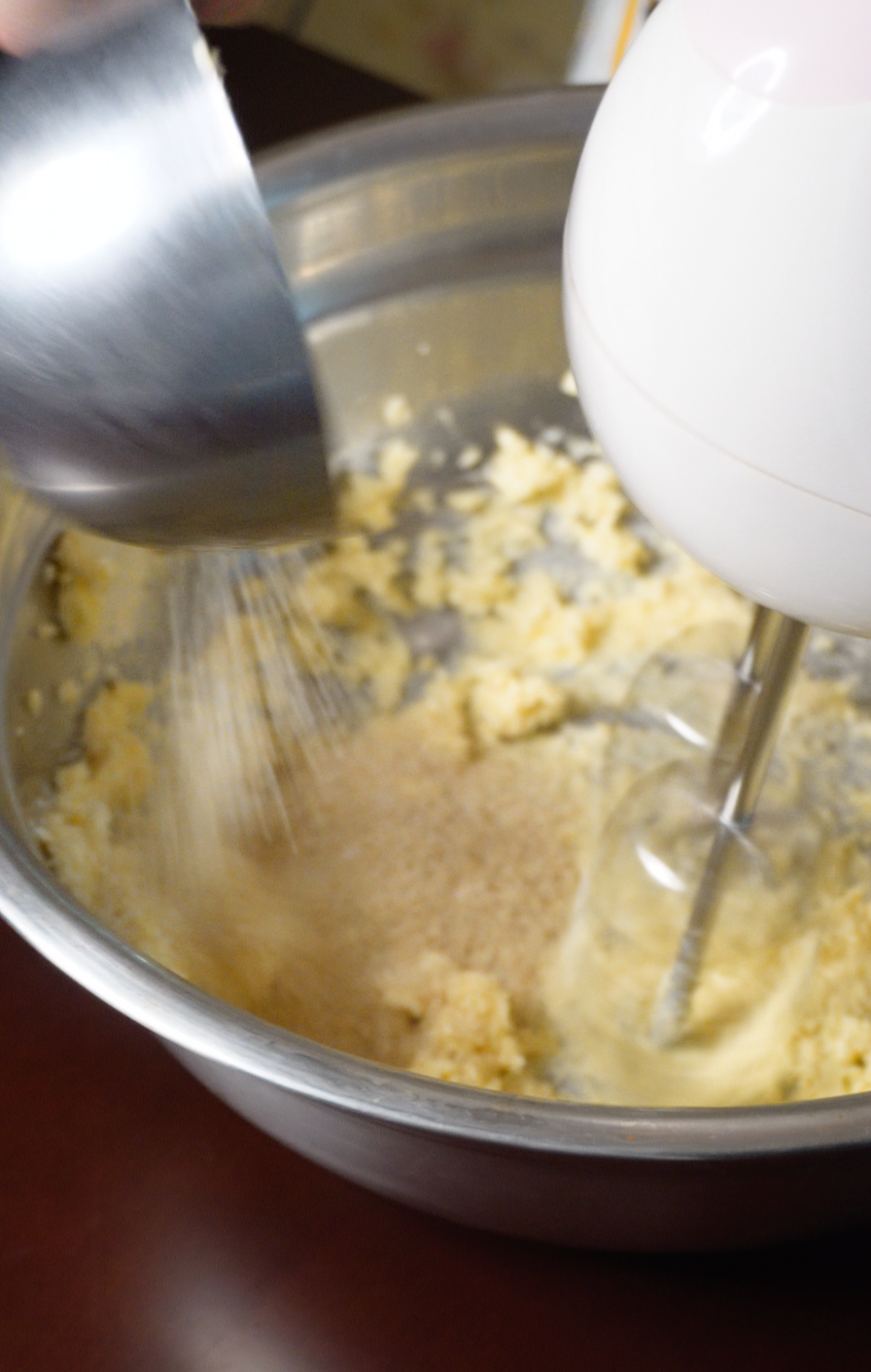 버터가 어느 정도 풀어졌으면 설탕을 넣고 크림화 작업을 해줄게요.
