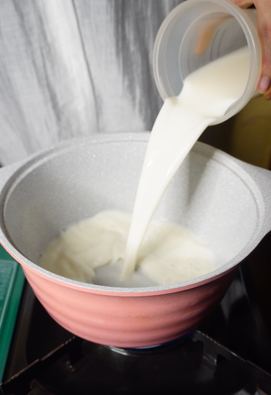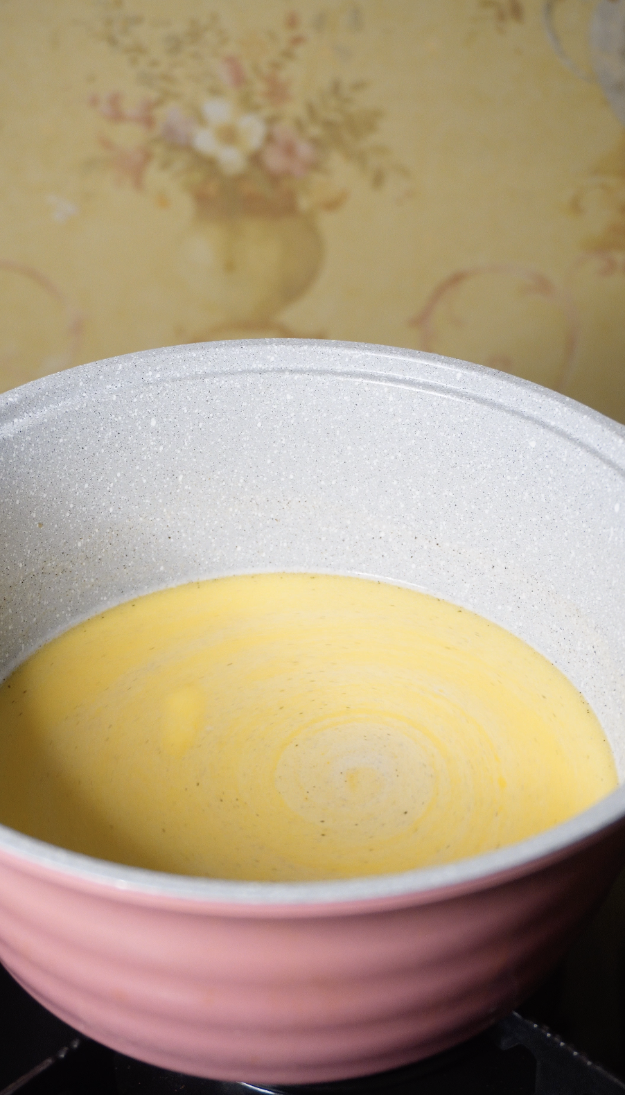우유에는 단백질이 있는데, 약불로 살짝 데우면 단백질이 안정적으로 유지되지만, 끓이면 단백질이 급격히 변성됩니다. 변성되면 덩어리지 거나 거품이 생기고, 까눌레 반죽과 섞였을 때 식감이 거칠어져요.