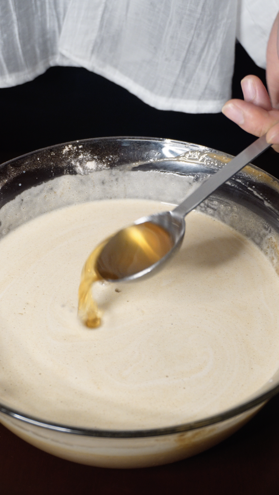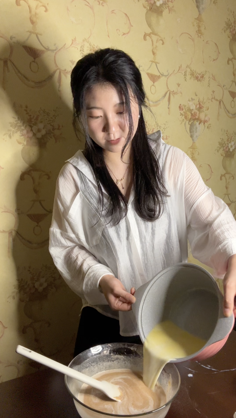 한 김 식힌 우유 혼합물을 두 번에 나누어 반죽에 섞어주세요.