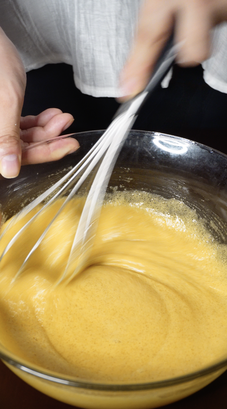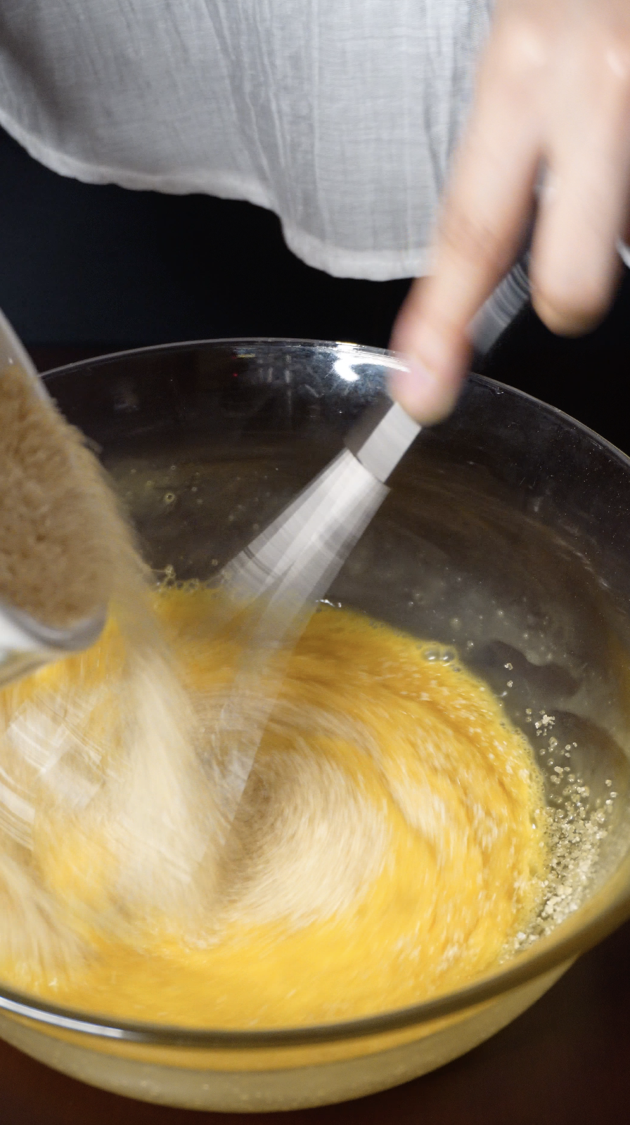 그다음 설탕과 소금을 넣고, 거품이 생기지 않도록 설탕이 녹을 정도까지만 부드럽게 혼합해 줄게요.