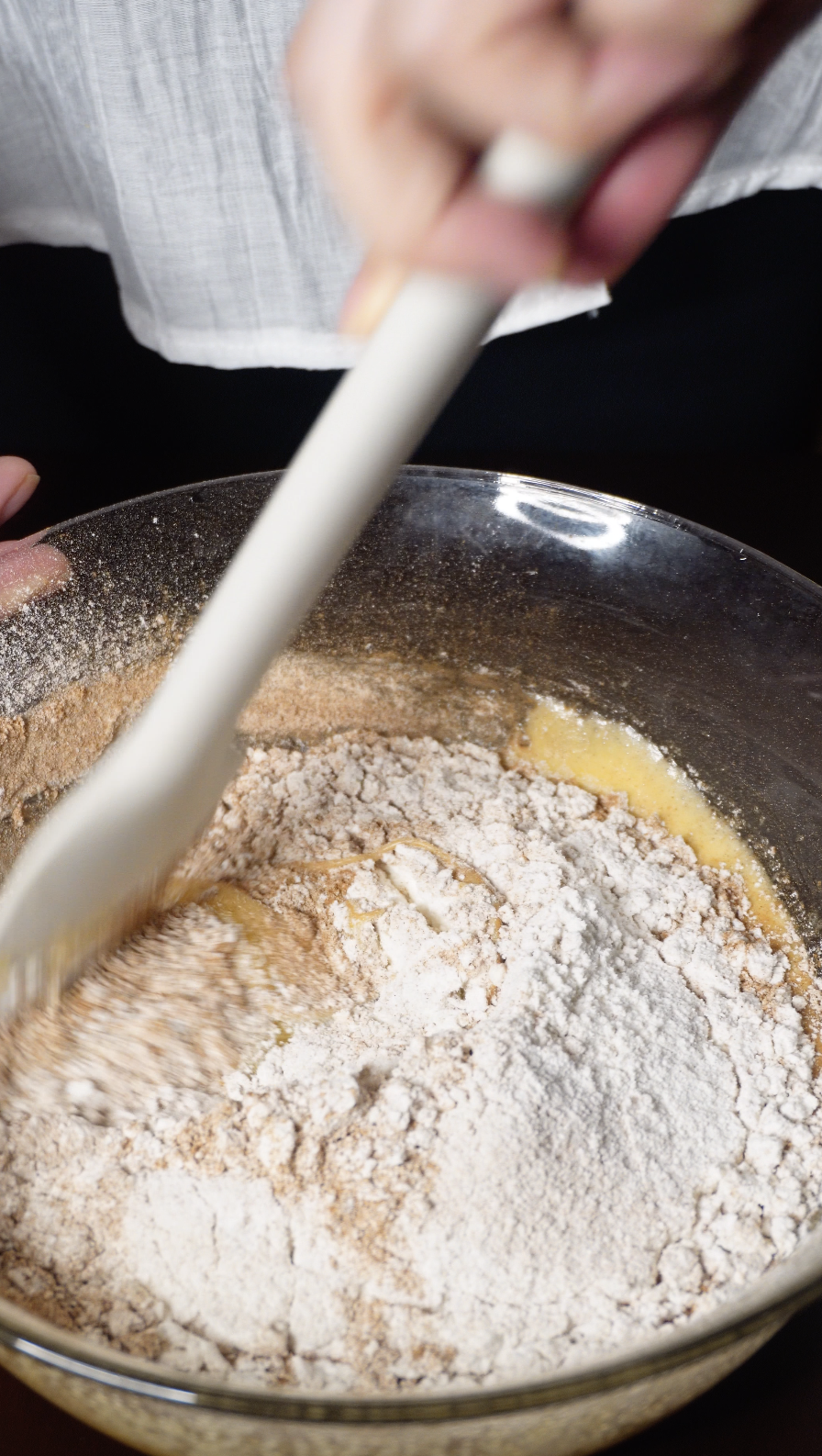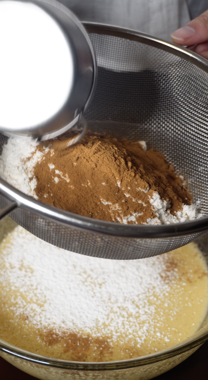 중력분과 시나몬 가루를 체에 쳐서 계란 혼합물에 넣고 고루 섞어줍니다.