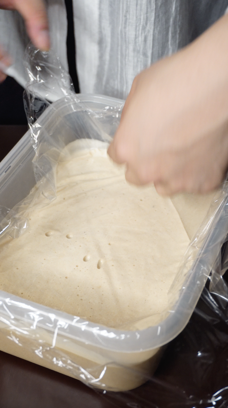 반죽 겉면을 랩으로 한 번 덮고, 뚜껑을 덮어 냉장고에서 24~48시간 숙성시킵니다.