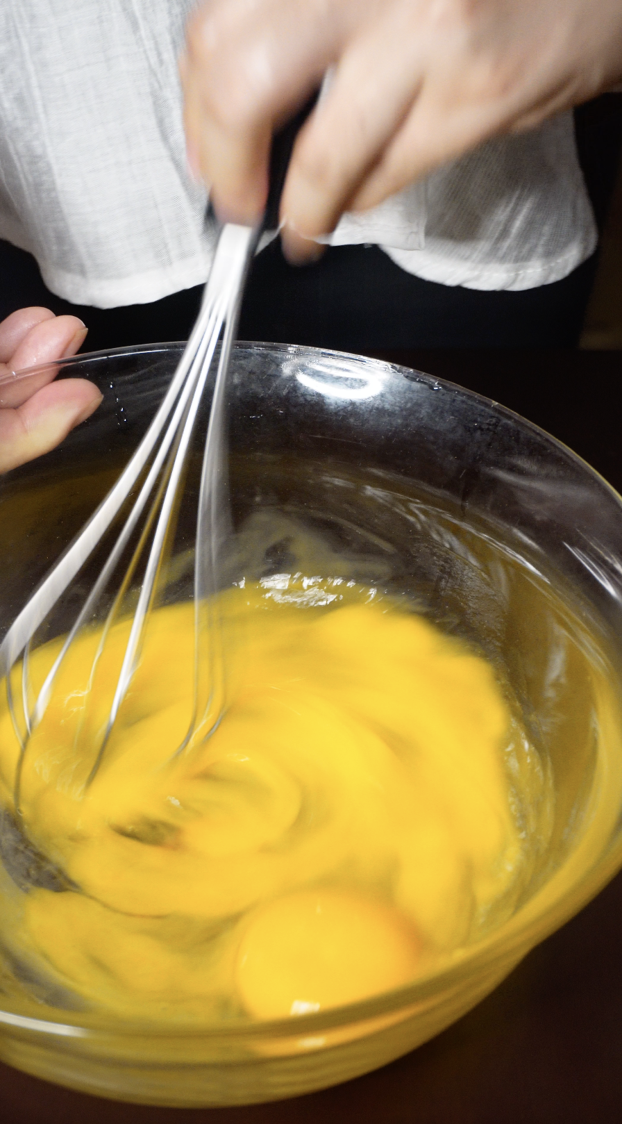 볼에 달걀 1개와 달걀노른자 2개를 넣어 가볍게 섞어줍니다.