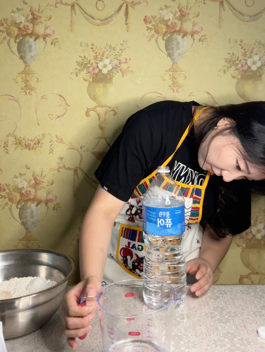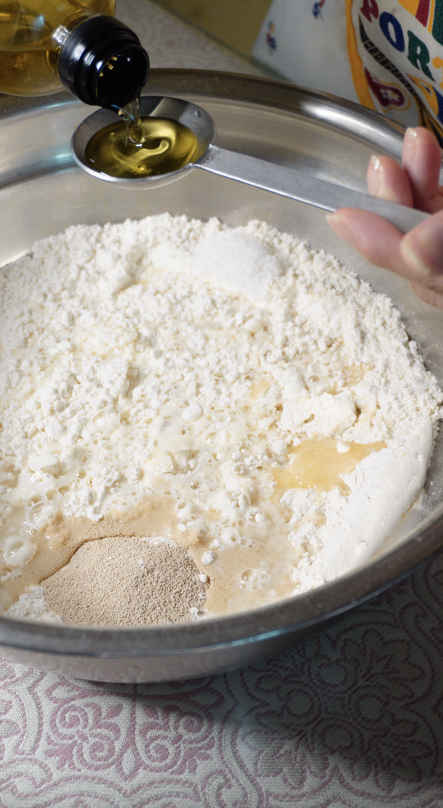 물과 올리브오일 넣고 손으로 섞으면서 가루와 드라이이스트가 자연스럽게 섞이도록 해 주세요,