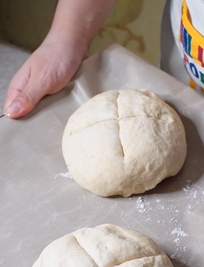 덧가루를 살짝 뿌린 뒤, 젖은 면포로 덮어 오븐 트레이에서 2차 발효를 진행합니다.