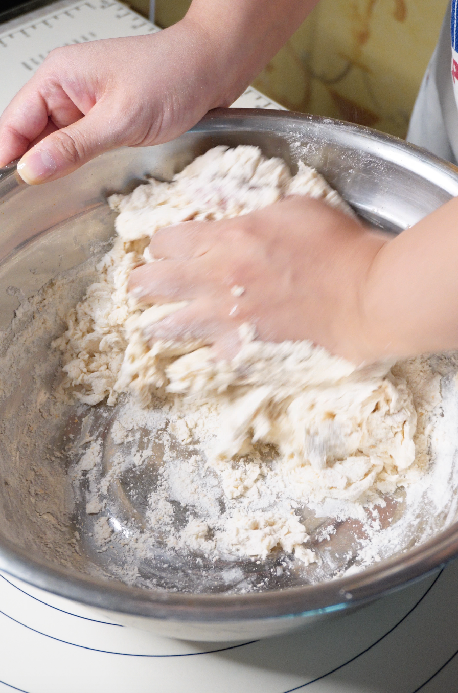 반죽이 하나로 뭉쳐지면, 손으로 밀고 접는 동작을 반복하며 10~12분 정도 치대 주세요.