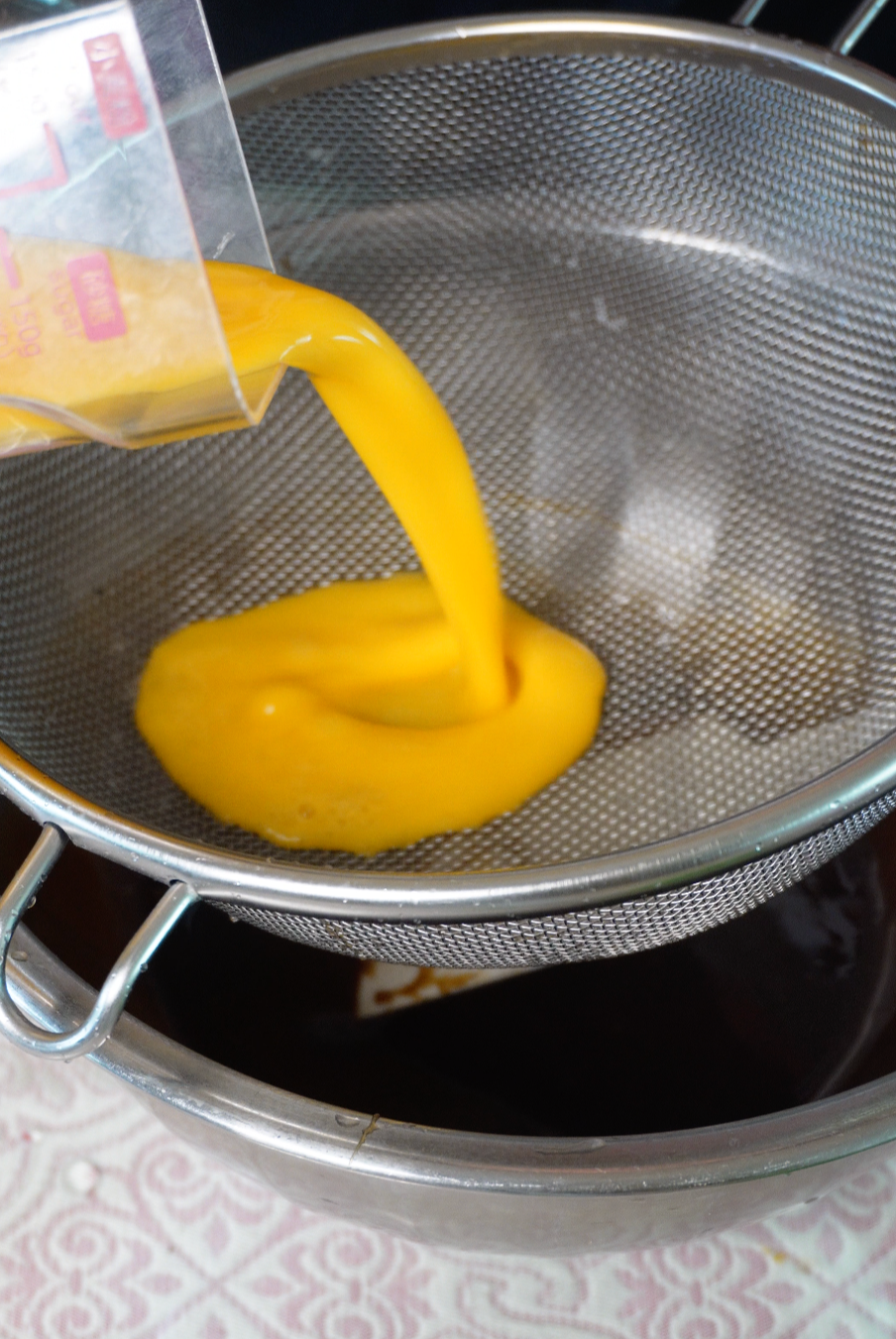 식힌 필링에 계란물을 넣고 섞어주세요. 뜨거운 상태에서 계란물을 넣으면 익기 때문에 꼭 식힌 다음에 넣어주세요.
