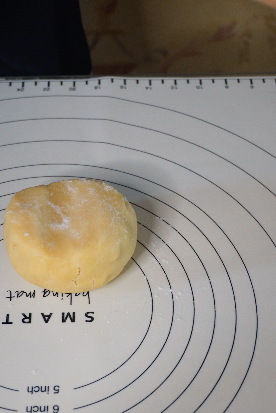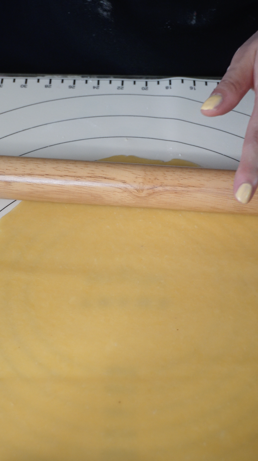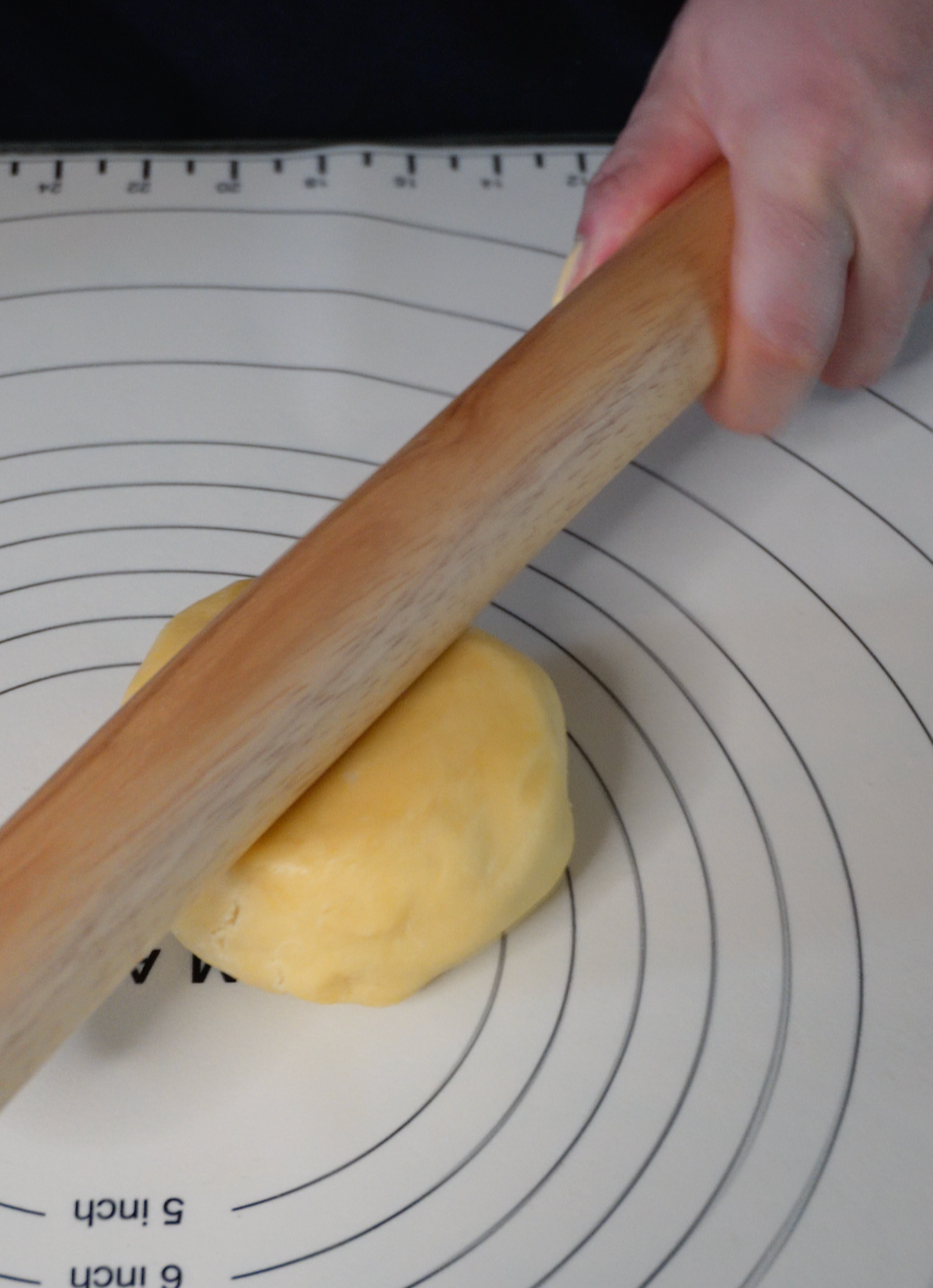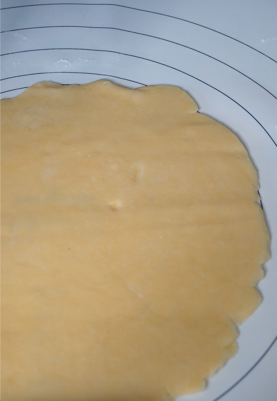 냉장 휴지가 끝난 반죽은 덧가루 살짝 뿌려가며 밀대로 밀어줍니다.