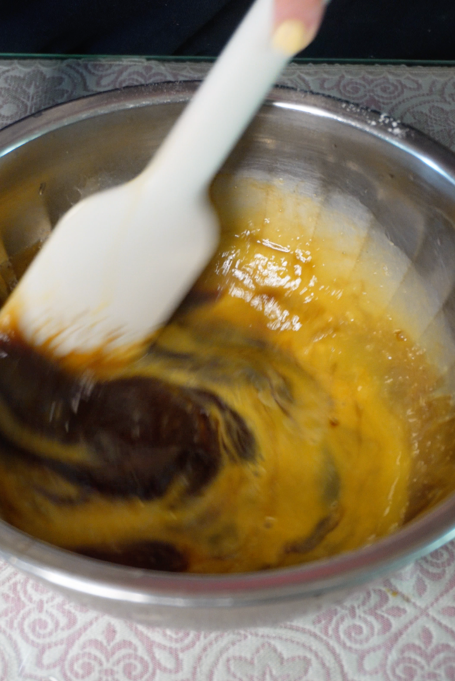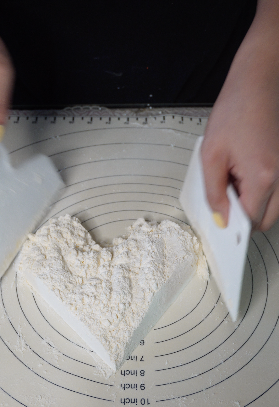 스크래퍼를 손바닥처럼 눌러 반죽을 아래로 밀어 버터 덩어리를 눌러 펴주세요. 단, 힘을 너무 주지 말고 살짝 눌러 버터가 반죽에 퍼지도록 합니다.