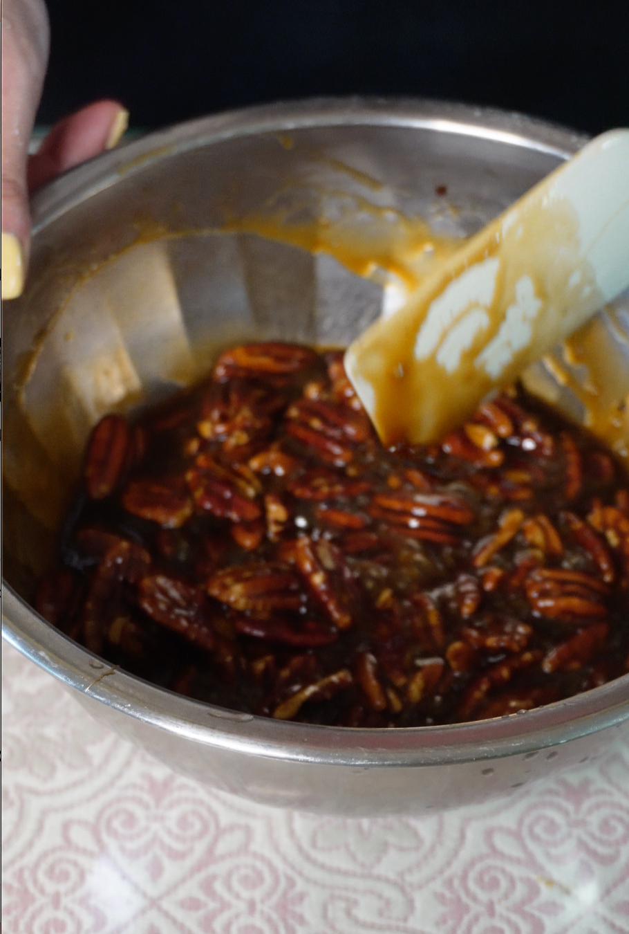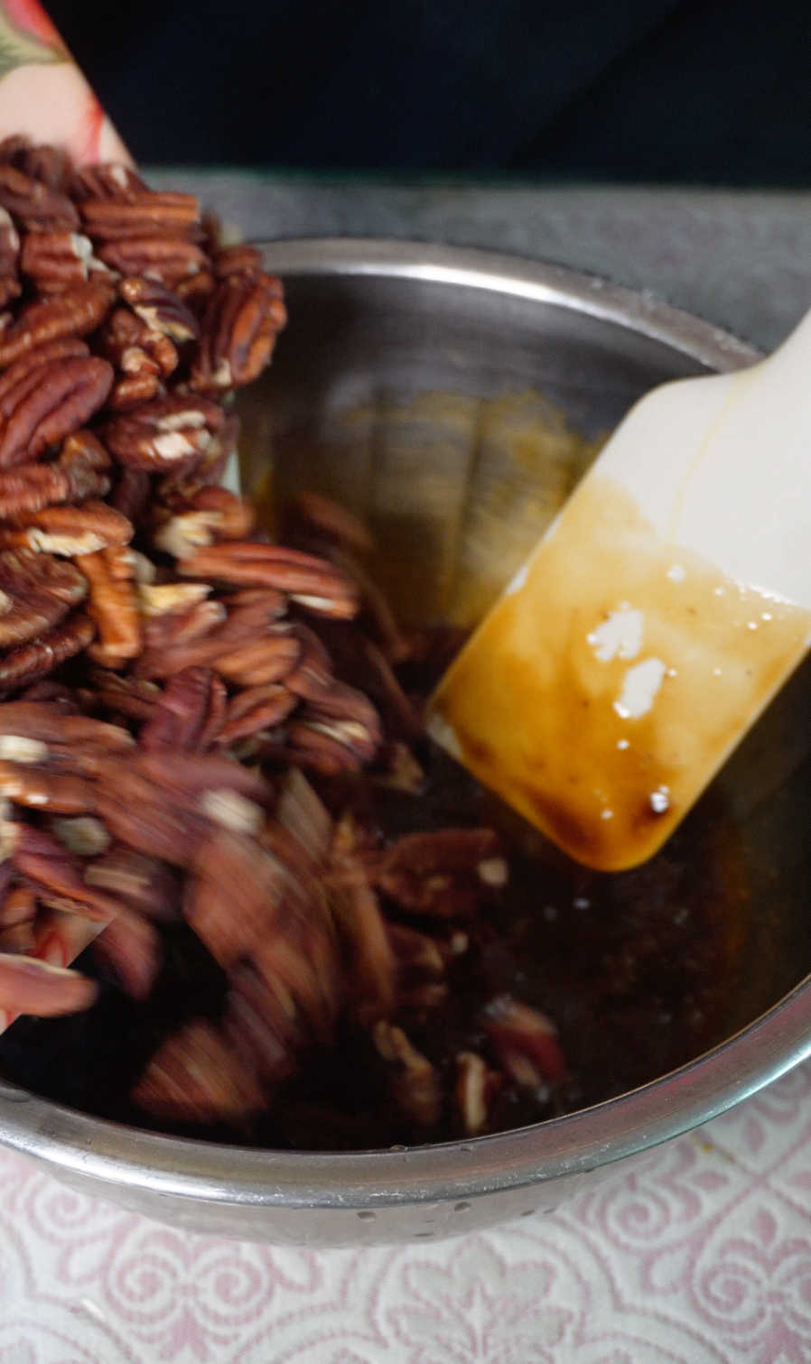 구운 피칸을 넣어 필링을 완성합니다.