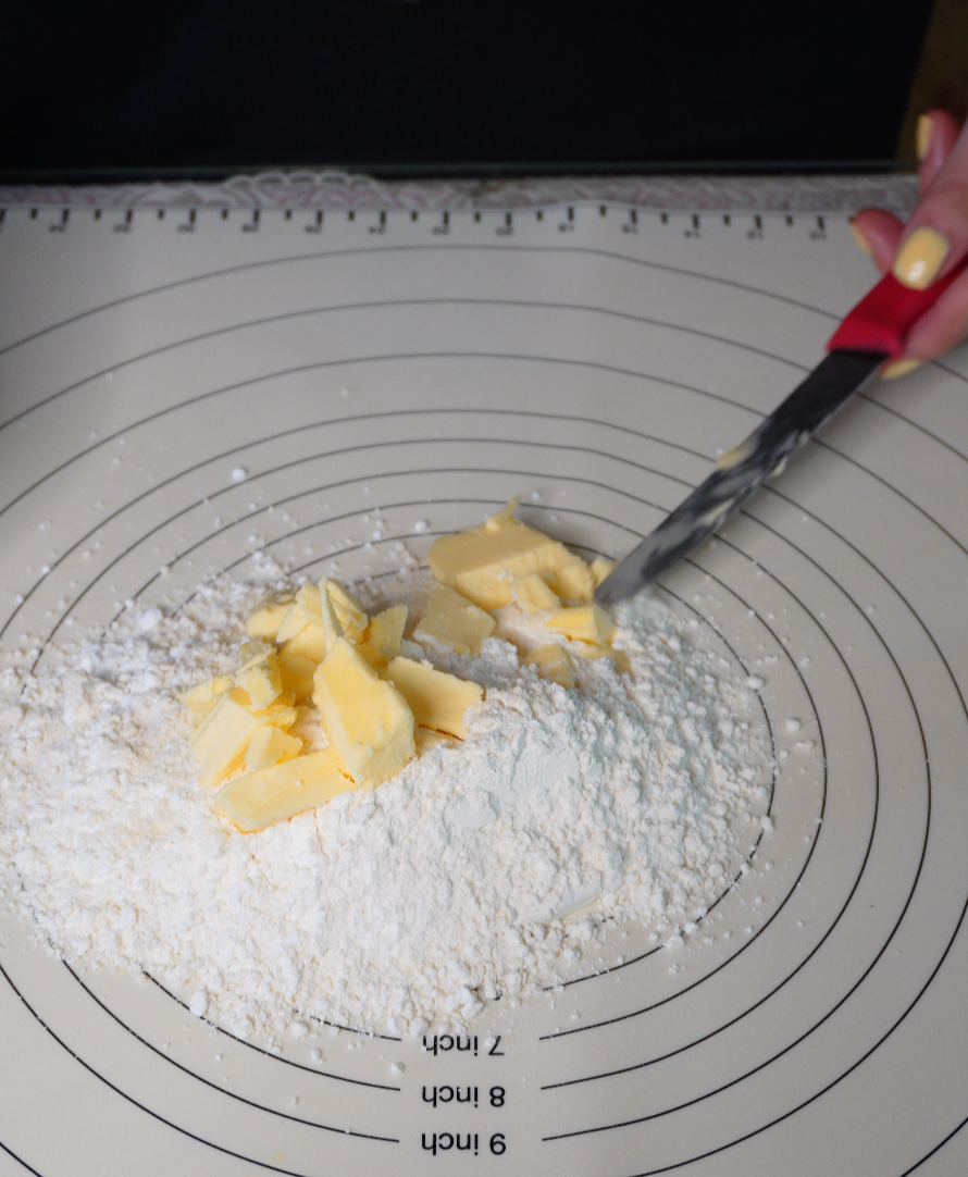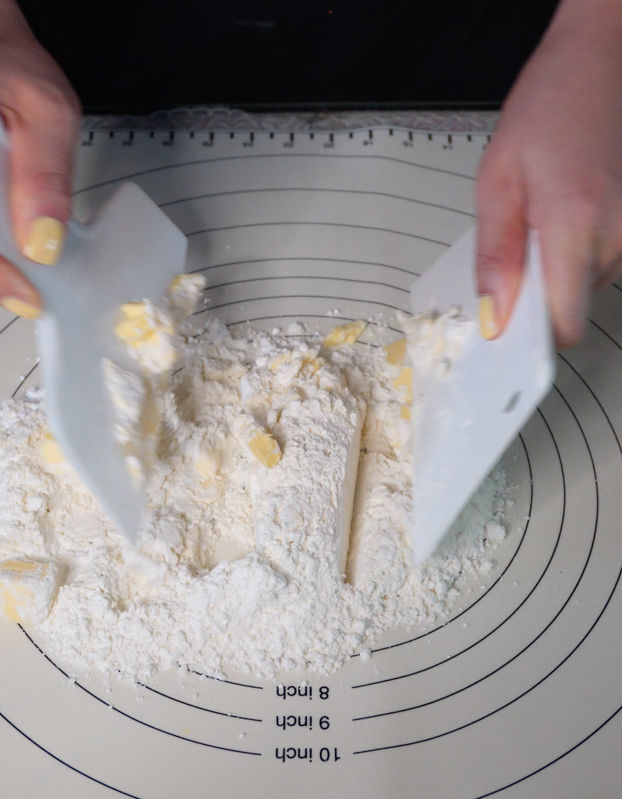 가루에 차가운 버터를 큐브로 썰어 넣고, 칼로 자르듯 스크래퍼로 섞어줍니다.