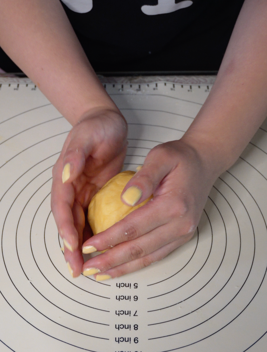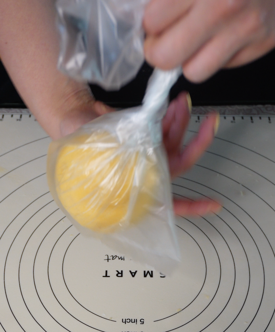 프라제 작업이 끝났으면 동그랗게 모양을 잡아 랩에 싸거나 비닐봉지에 넣어 1시간 정도 냉장 휴지해 줍니다.