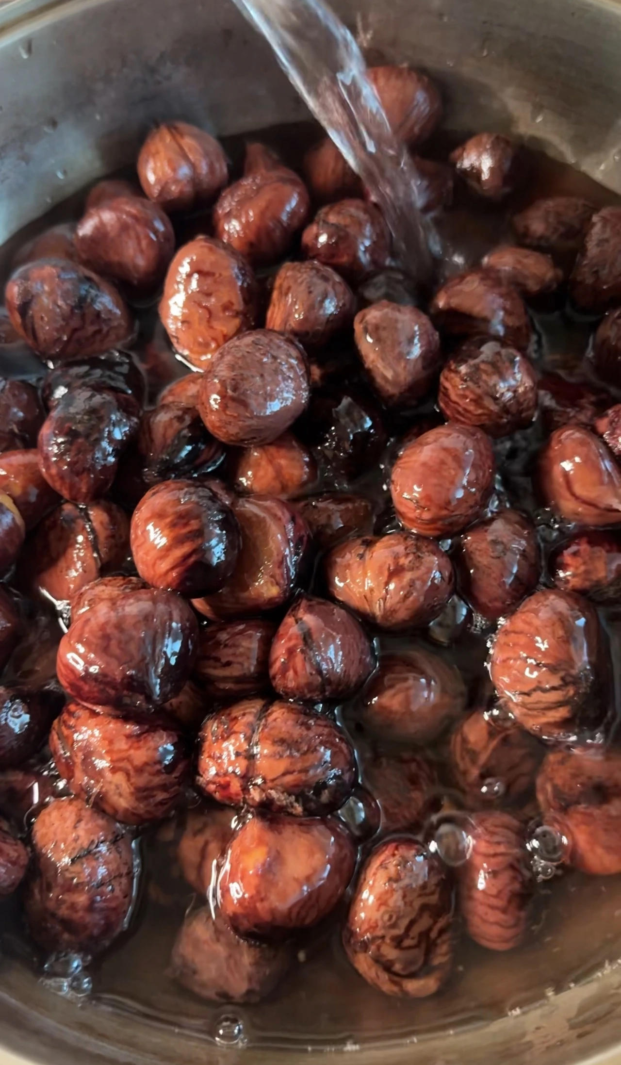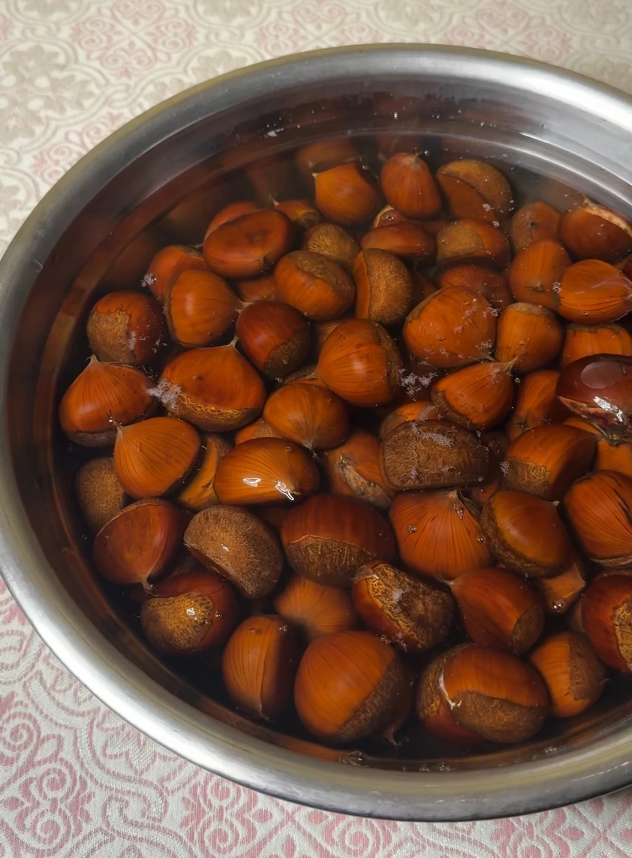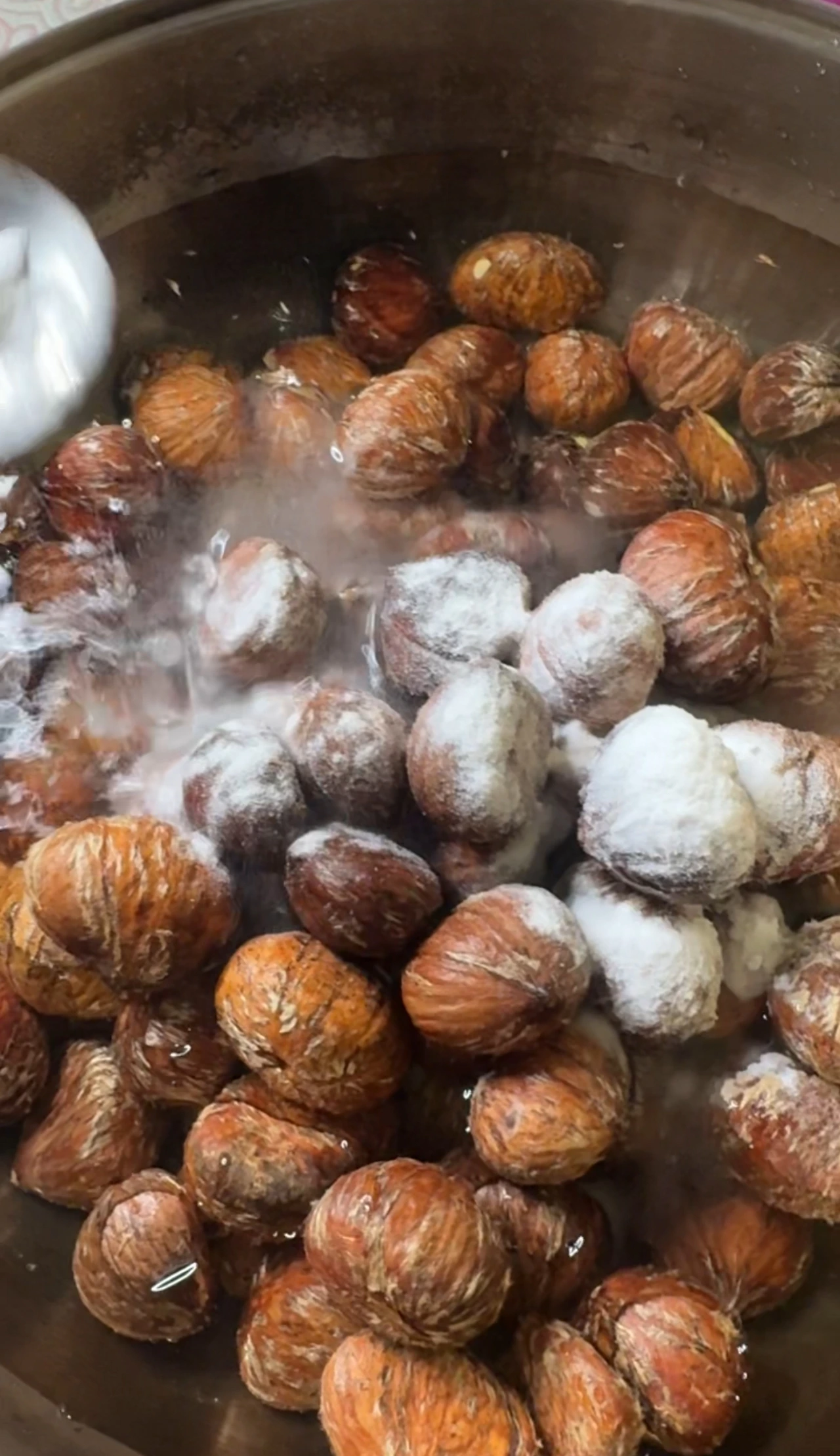 이 과정은 밤 껍질의 쓴맛을 제거하고, 식감을 부드럽게 만들어 주는 단계입니다.