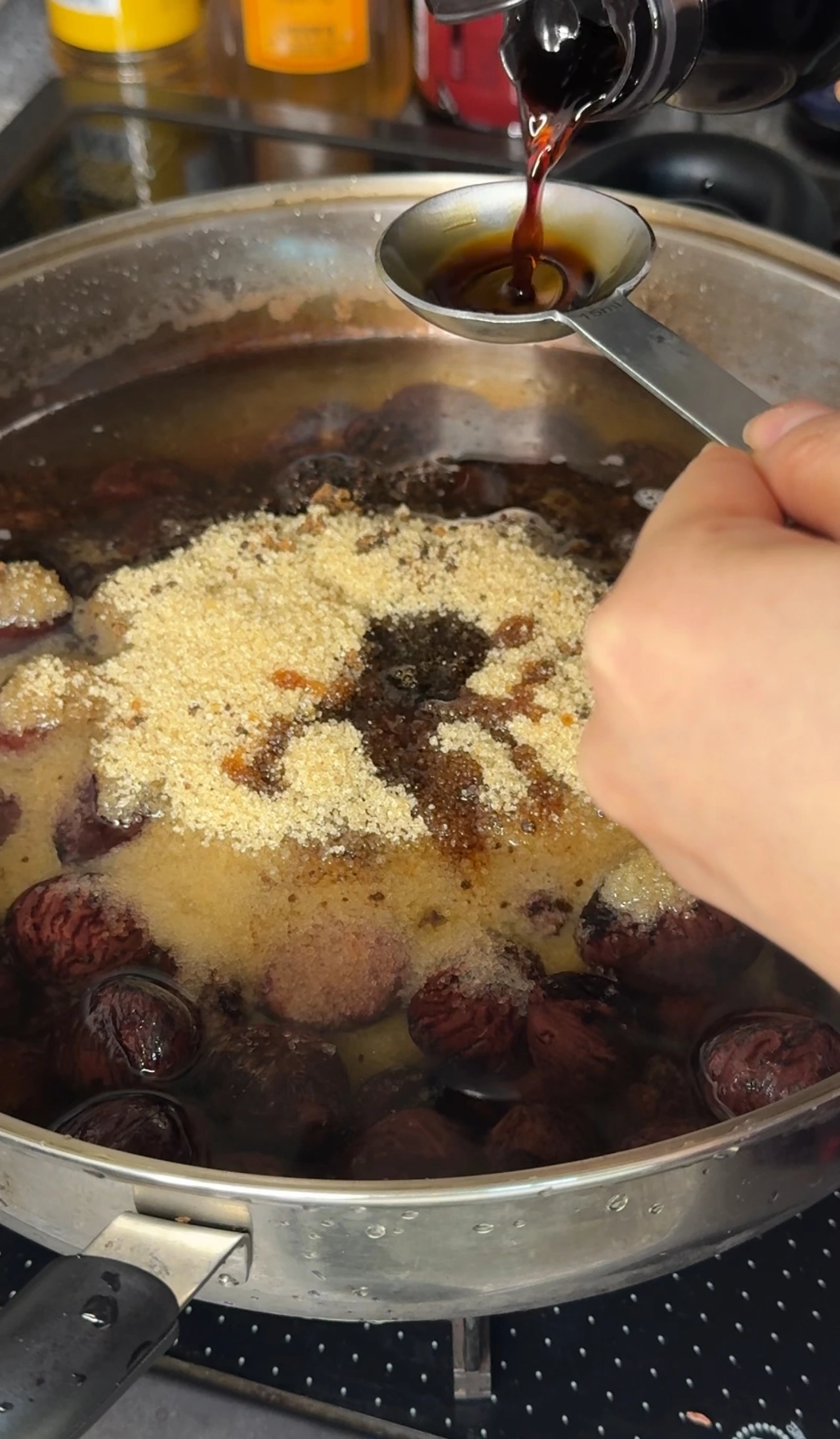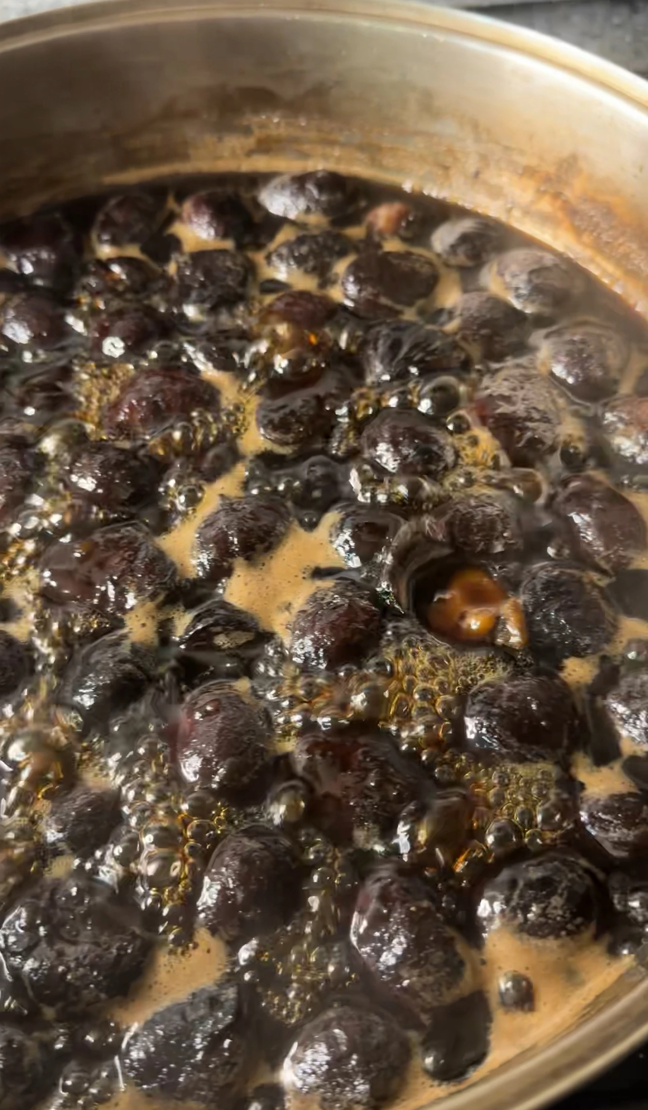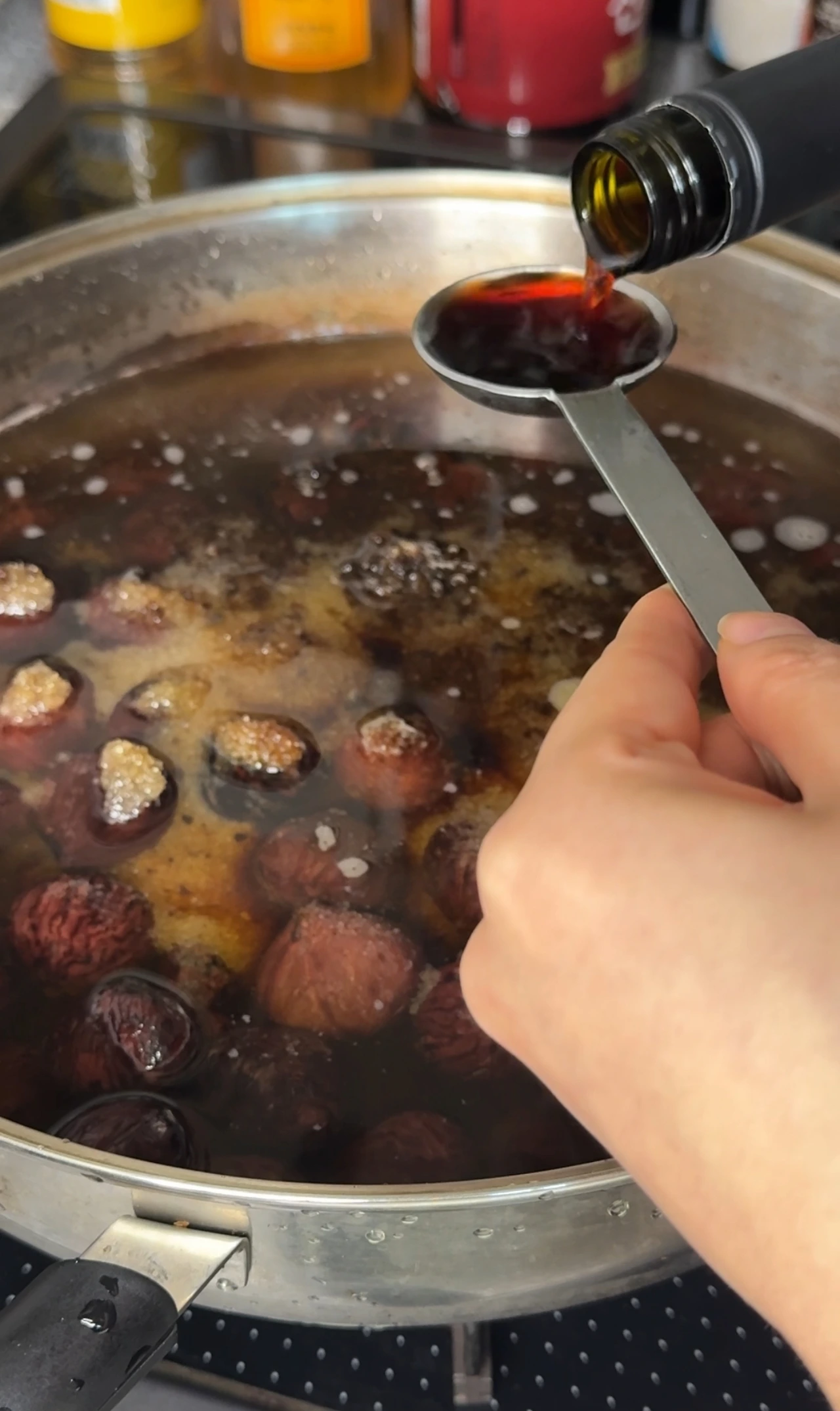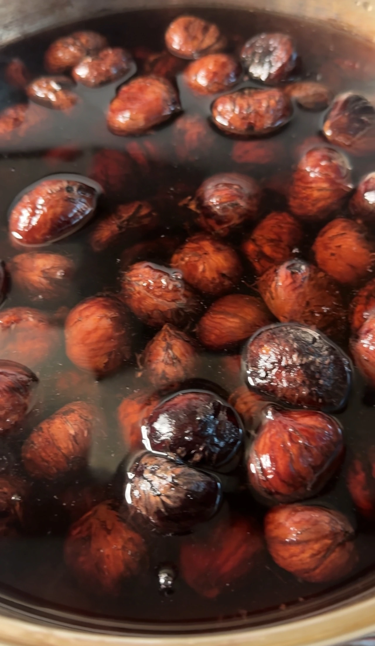 농도를 보면서 원하는 점도에 맞게 조려주면 되고, 완성될 때쯤이면 밤에 윤기가 흐르는 모습을 볼 수 있어요.