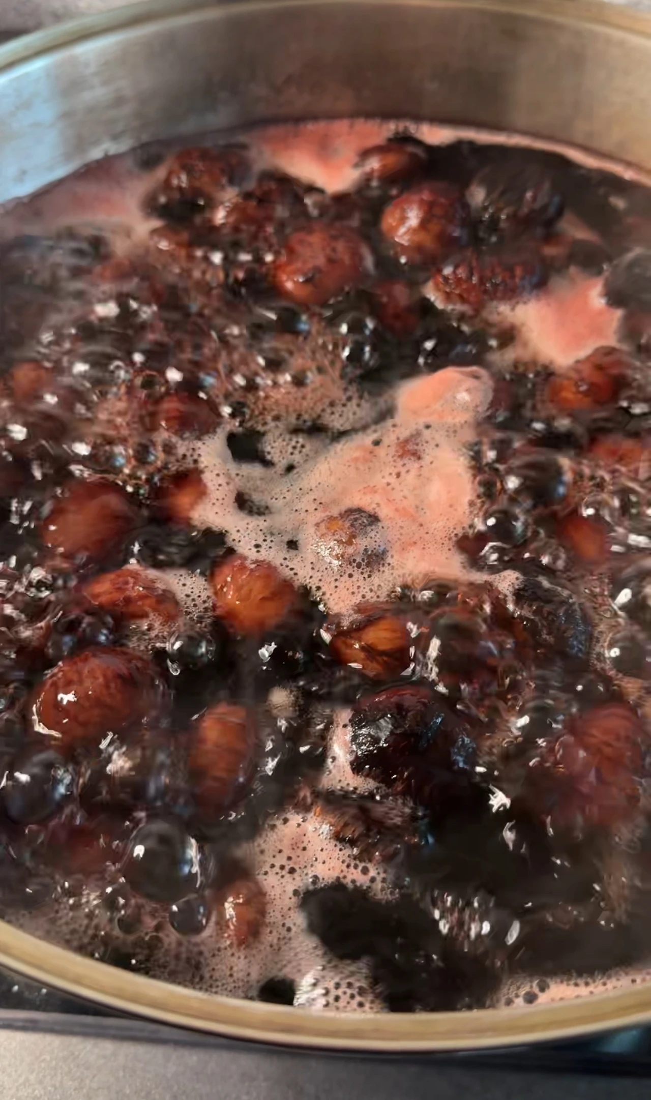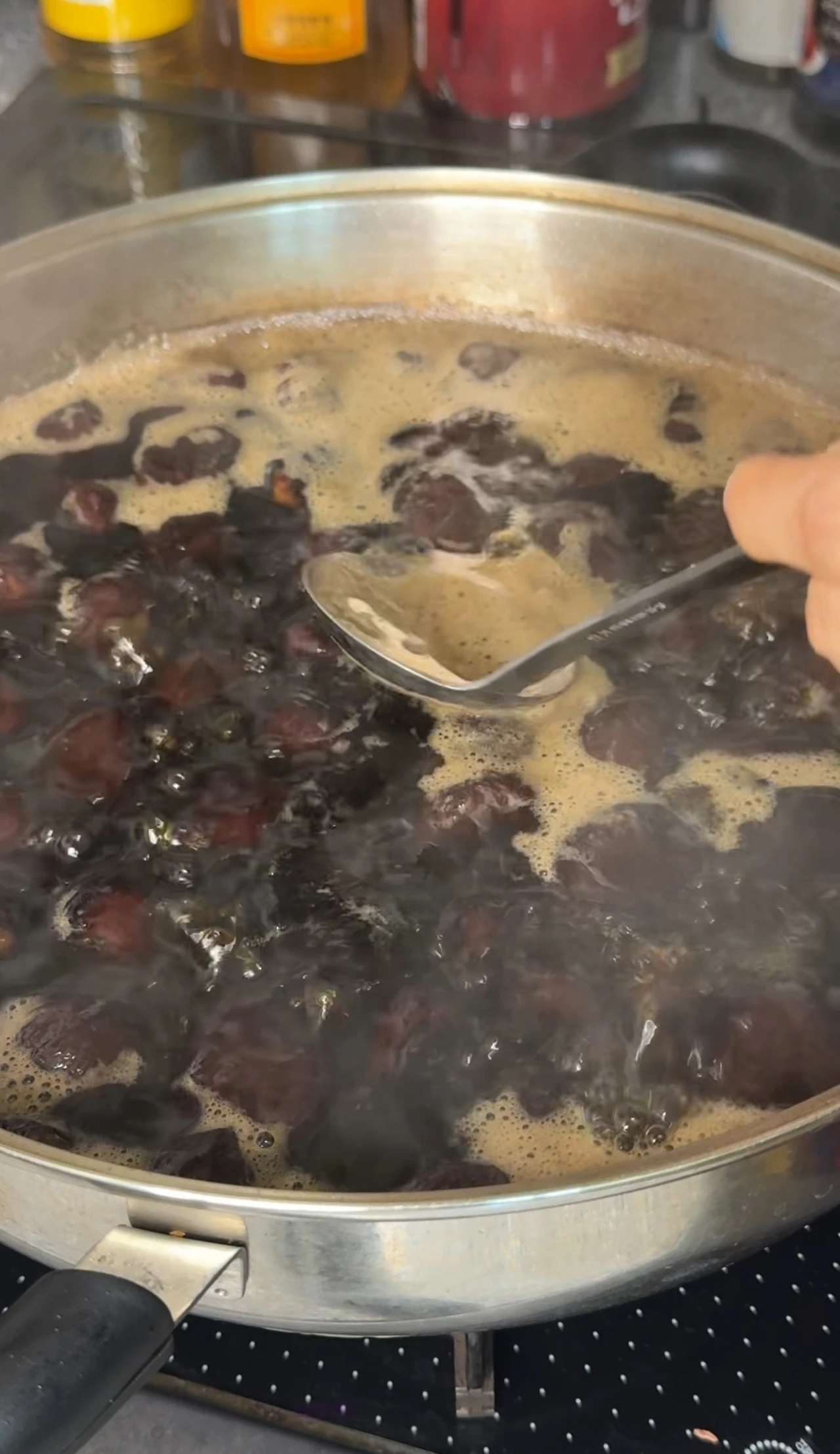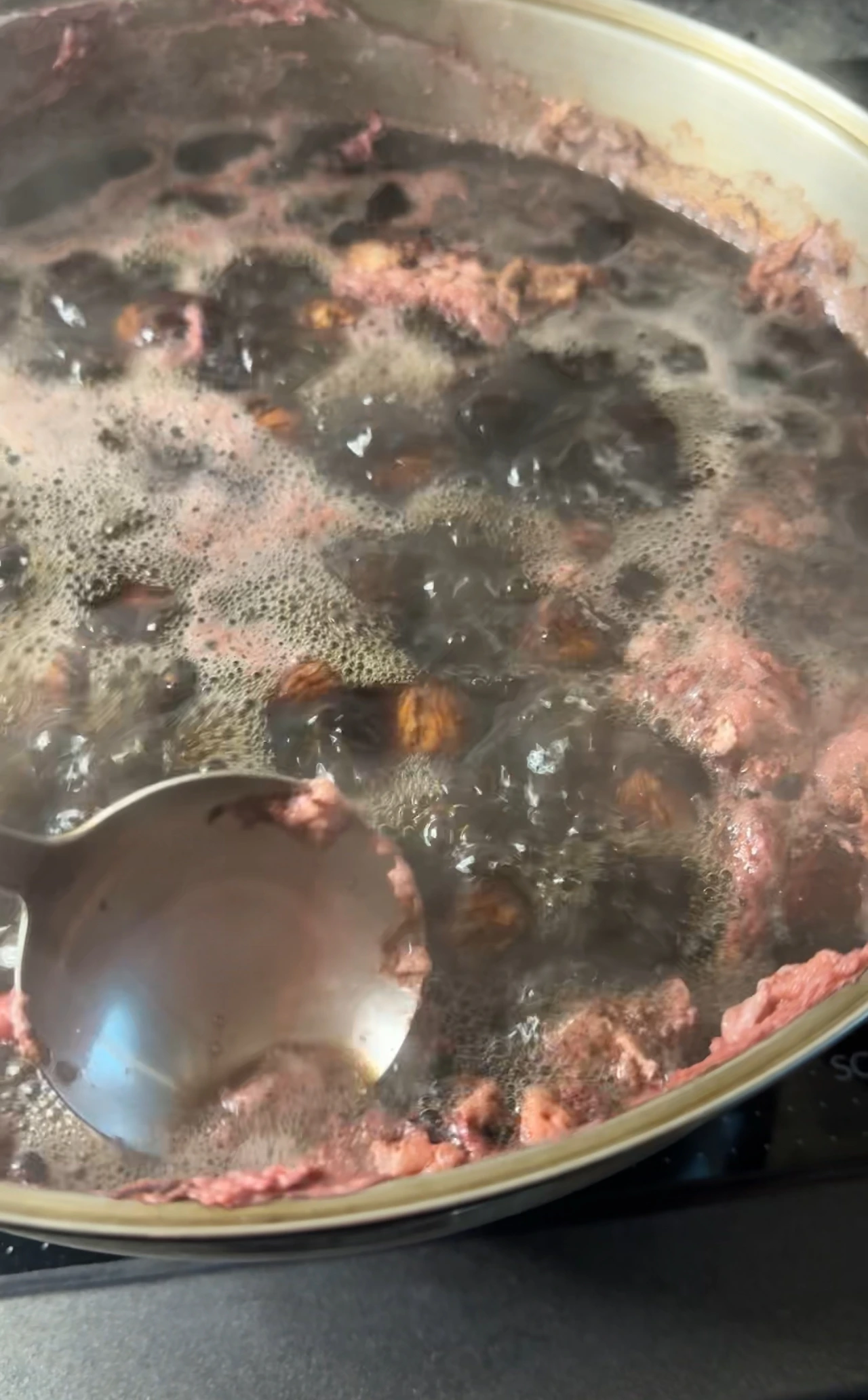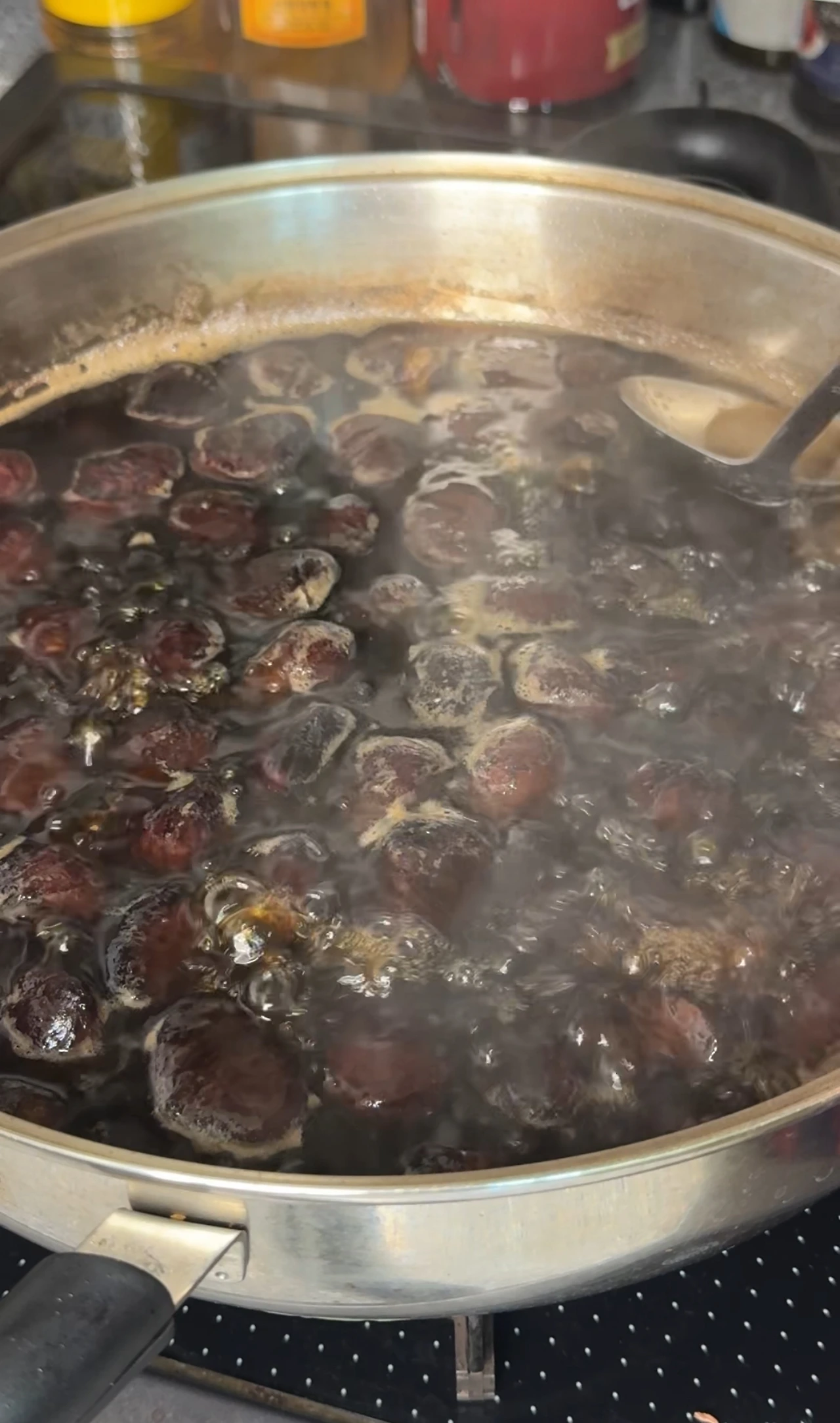 농도를 보면서 원하는 점도에 맞게 조려주면 되고, 완성될 때쯤이면 밤에 윤기가 흐르는 모습을 볼 수 있어요.