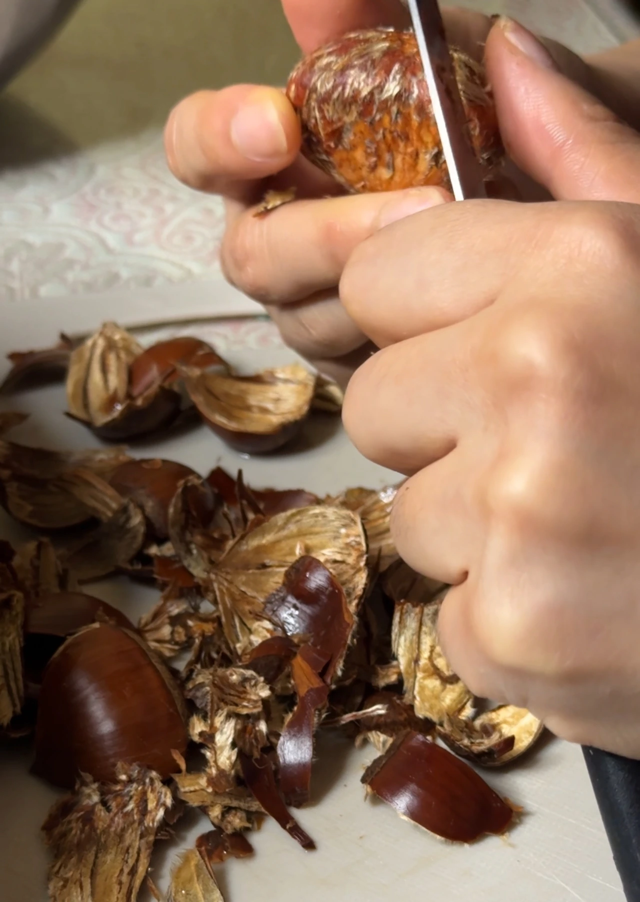 가능하면 율피가 손상되지 않도록 조심해서 껍질을 벗겨 주세요. 율피가 많이 상하면 조리 과정에서 갈라지면서 밤이 터질 수 있습니다.
