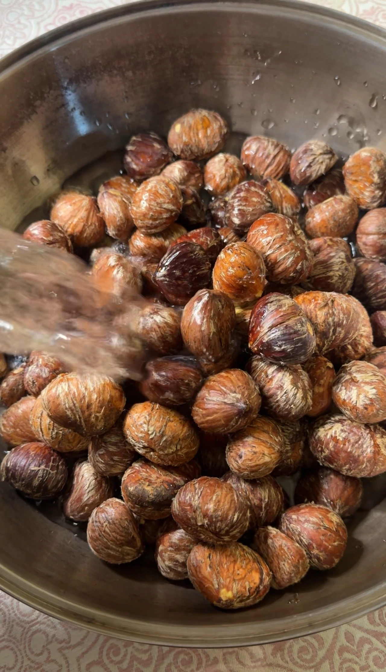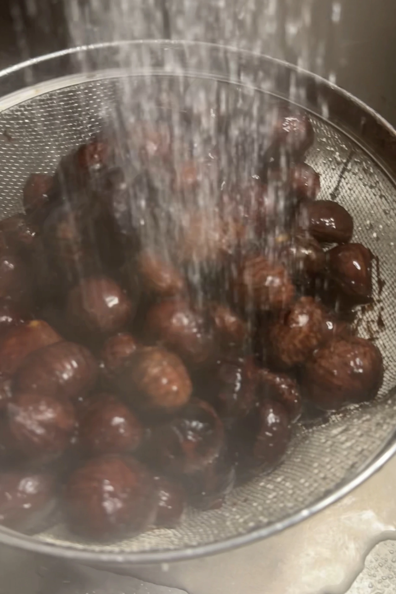 밤은 미지근한 물로 부드럽게 헹궈줍니다. 찬물로 헹구면 온도 차 때문에 밤이 갈라지거나 깨질 수 있으니 주의해 주세요.