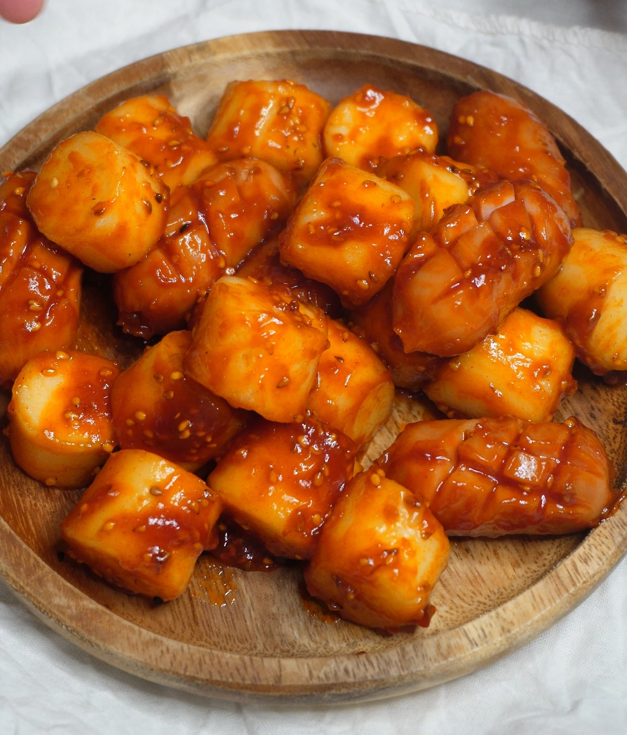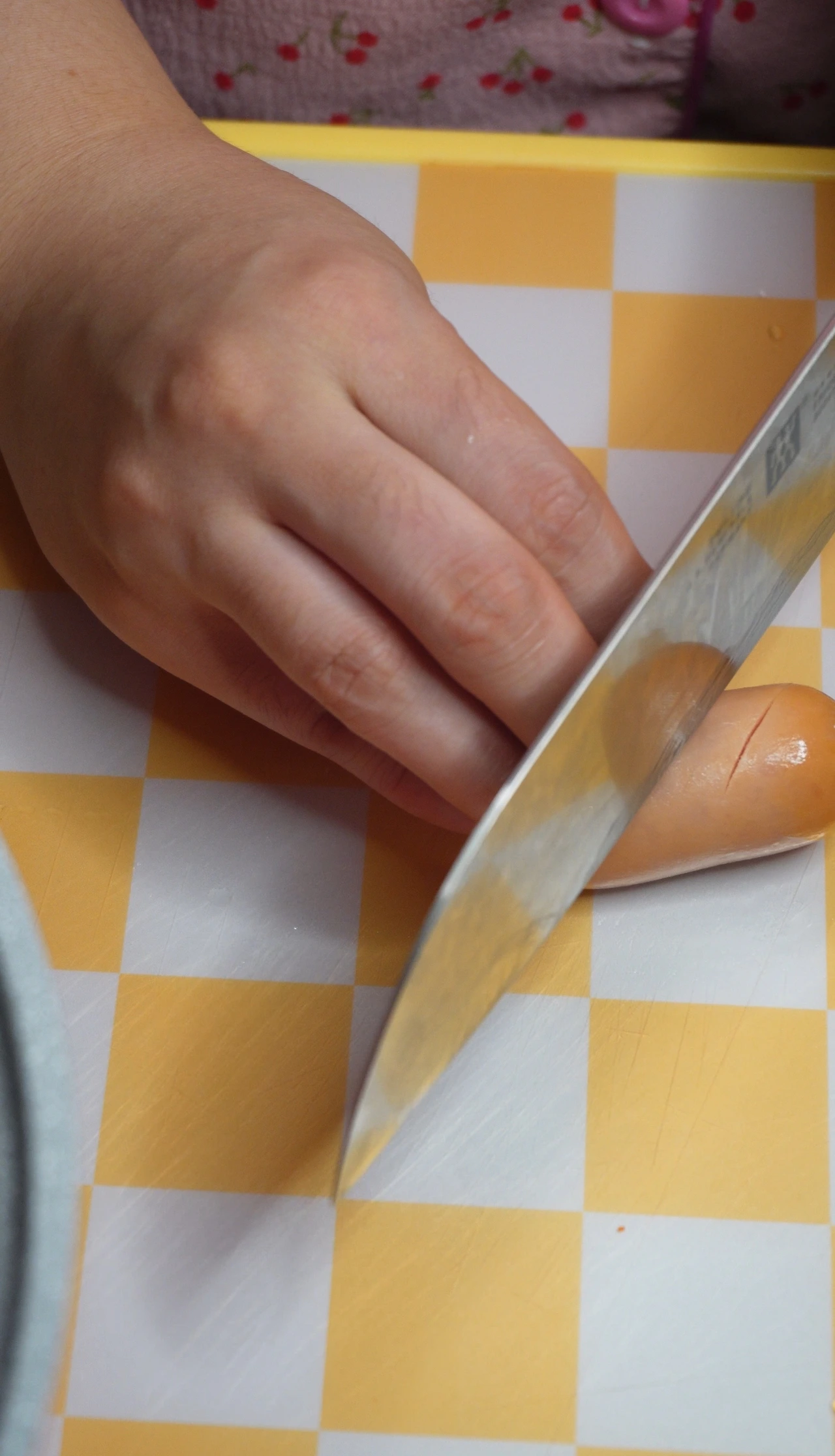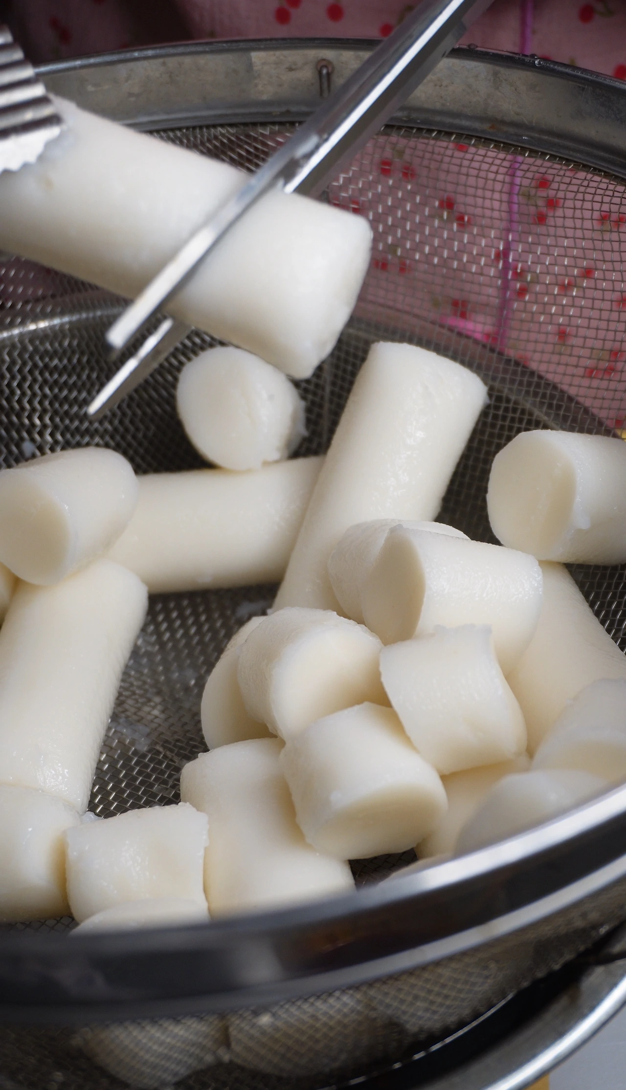 말랑한 가래떡을 한 입크기로 자르고 소세지에 칼집을 내줄게요.