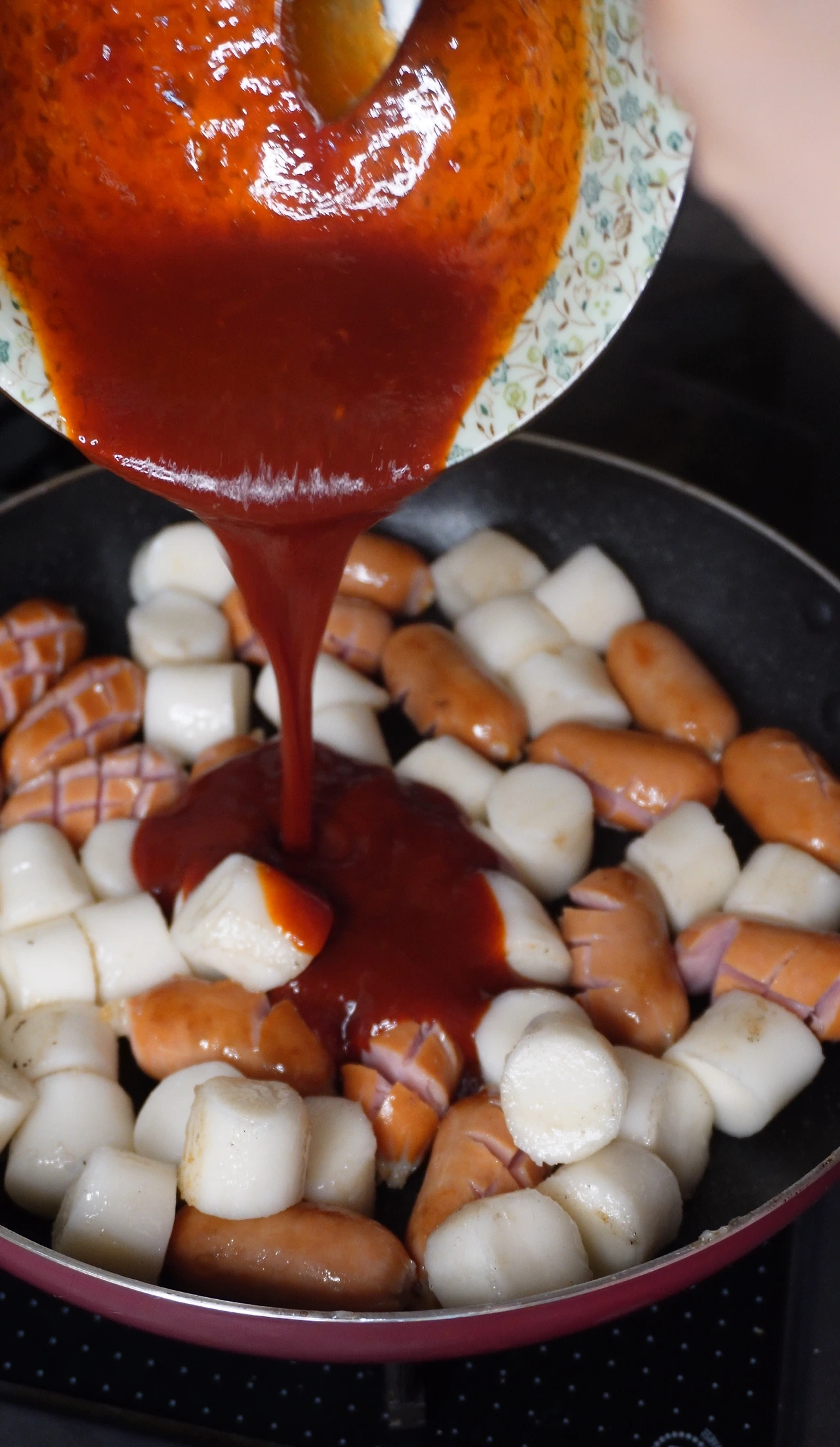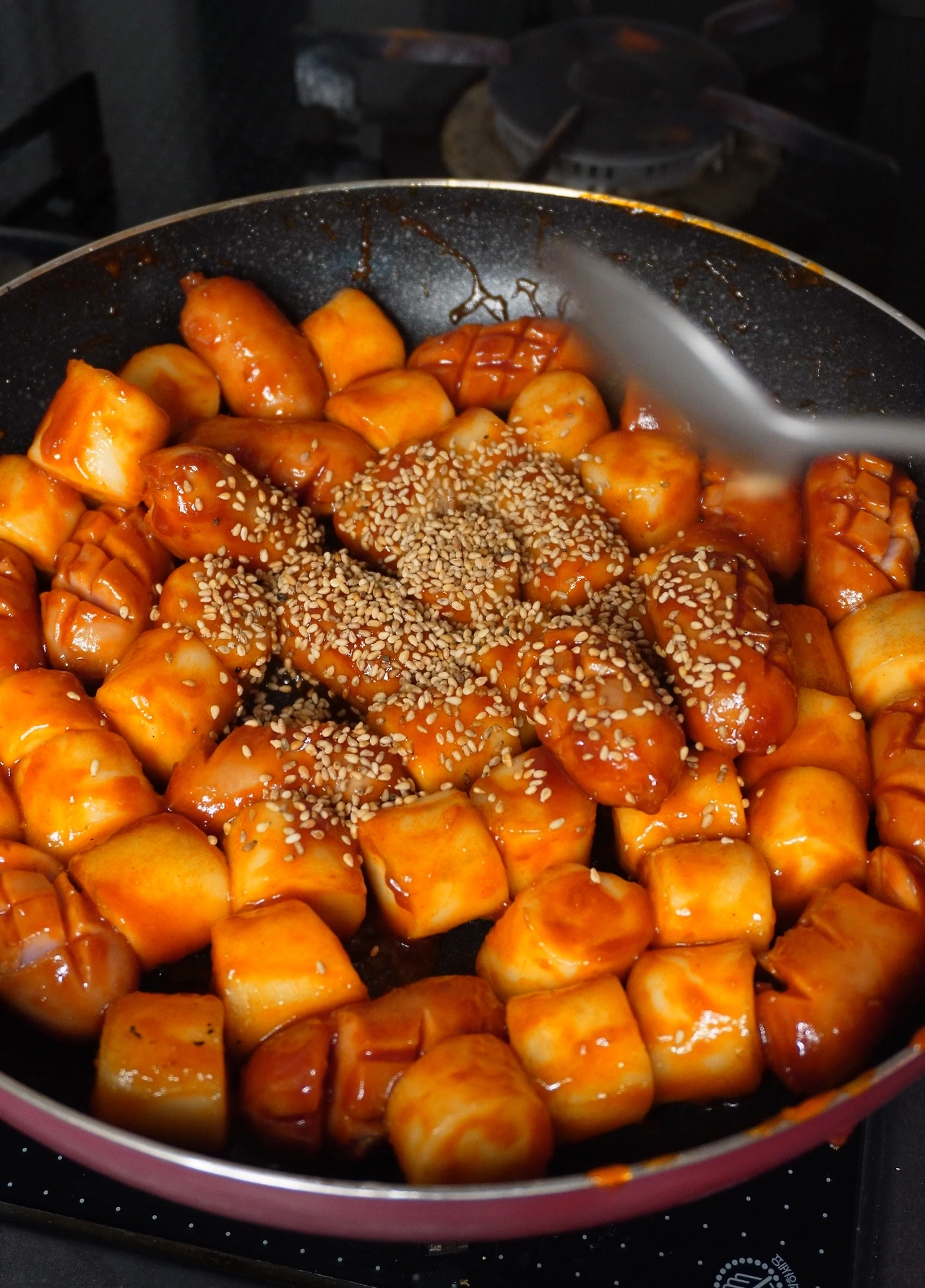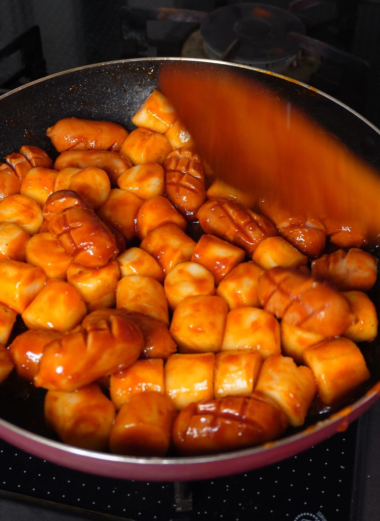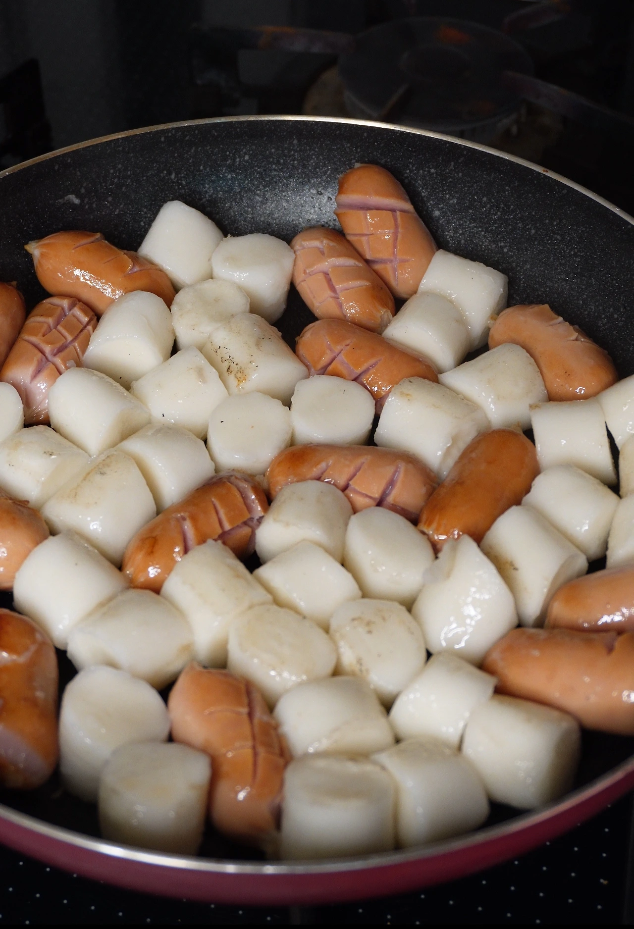 달군 팬에 기름을 두르고 떡과 소세지를 골고루 구워주세요.