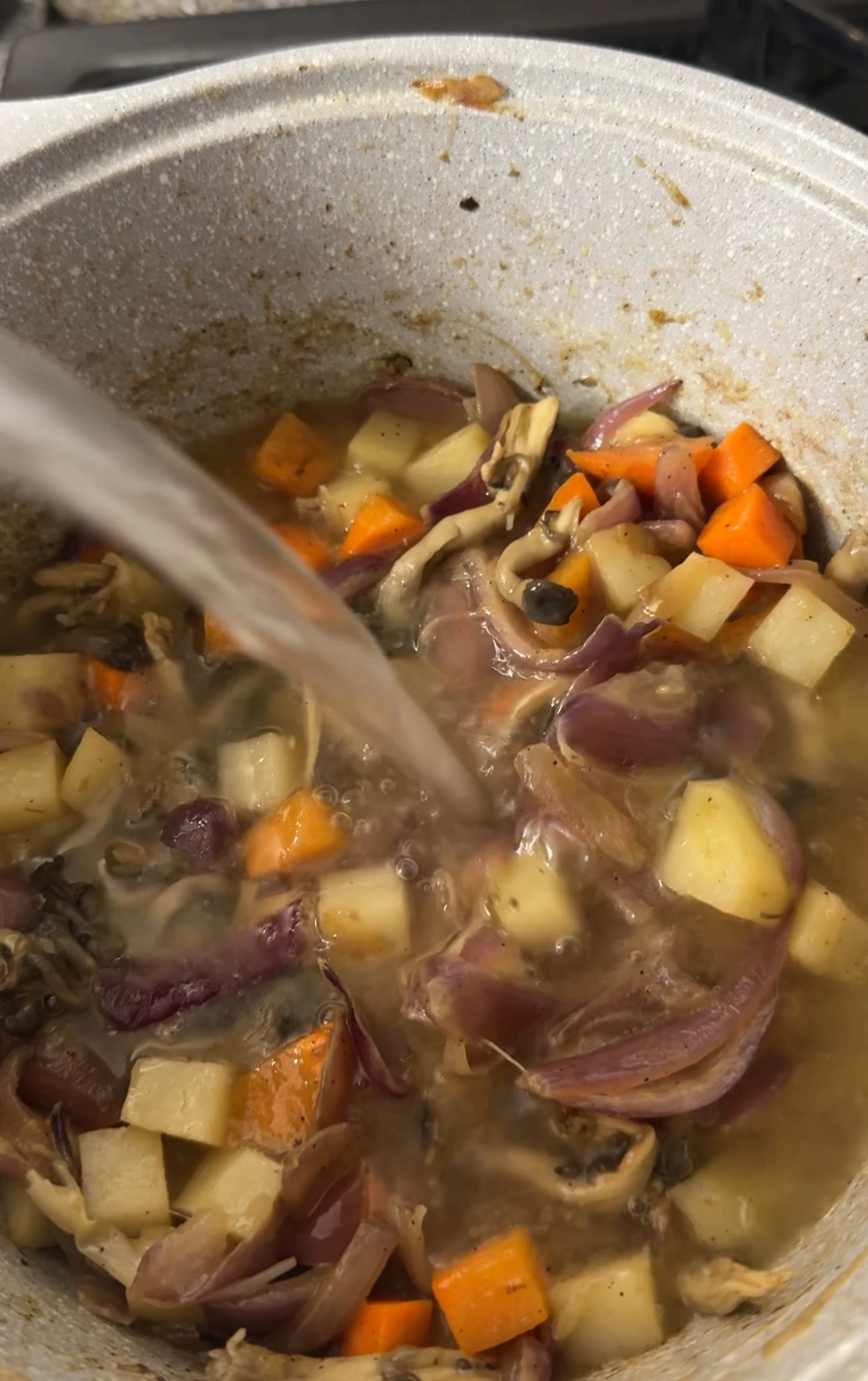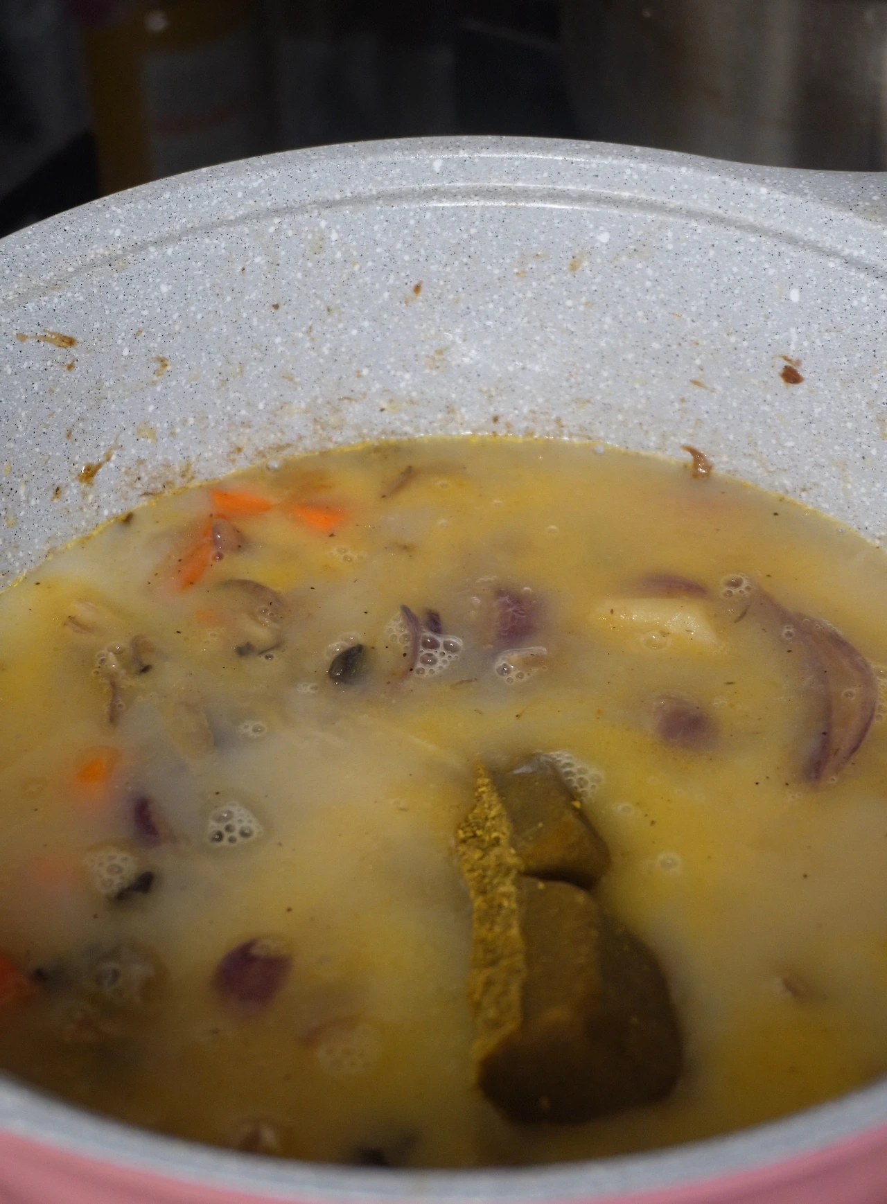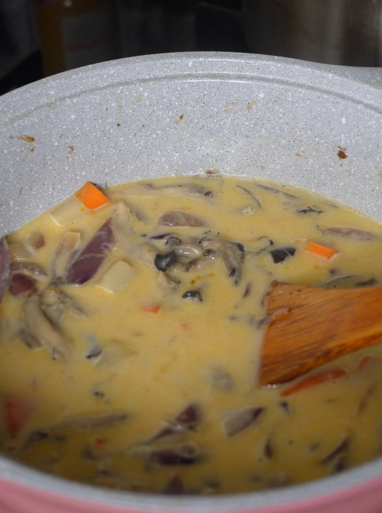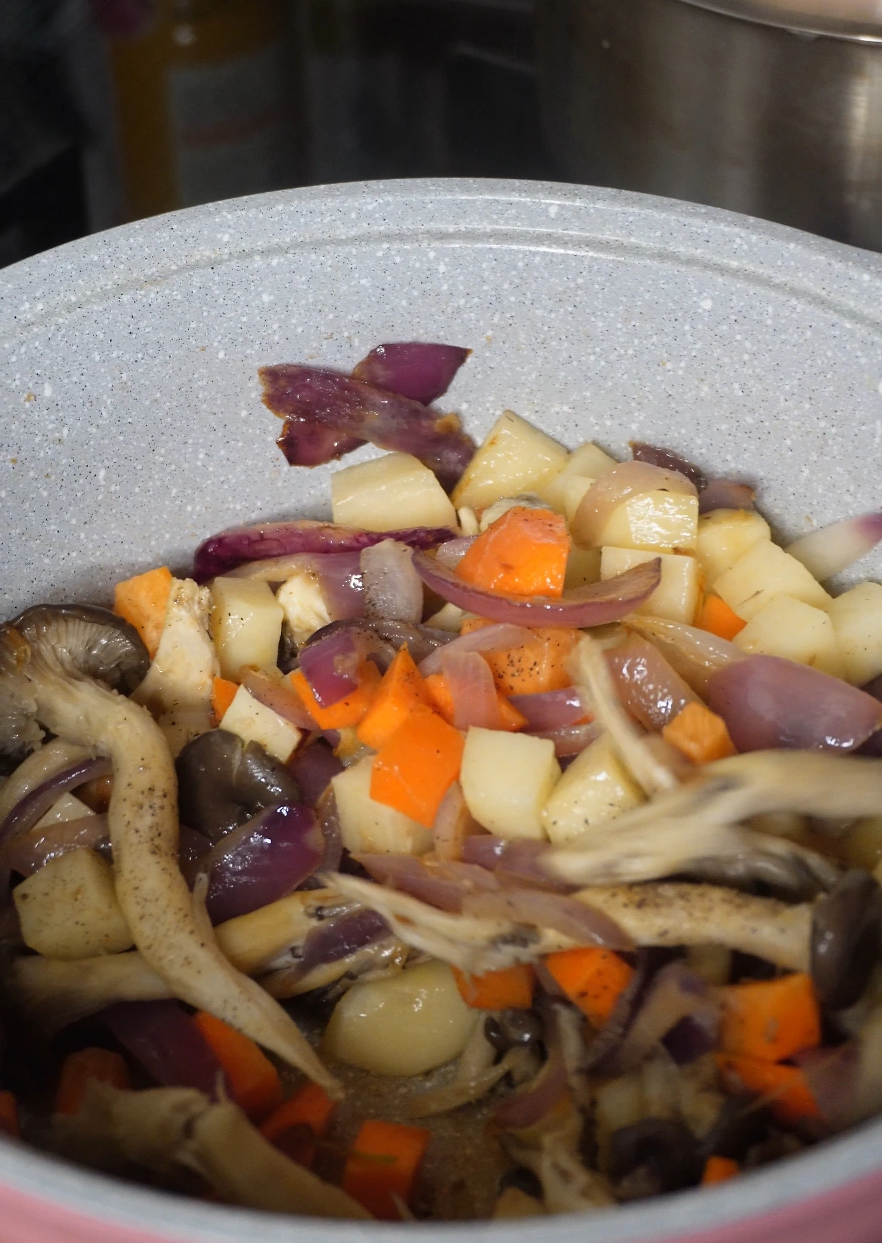 야채가 어느 정도 볶아지면 물과 우유를 부어줄게요.