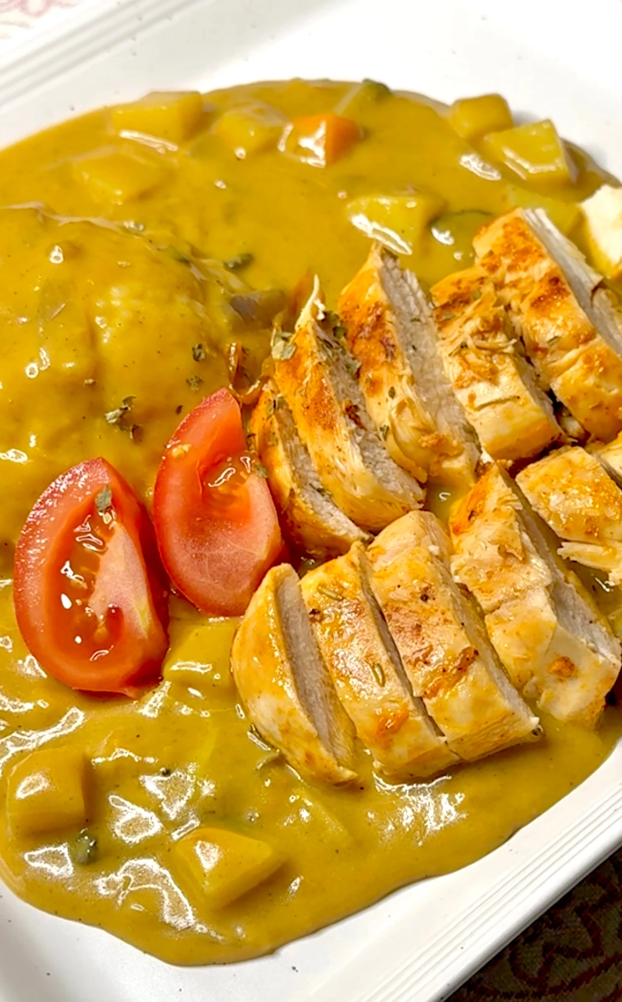 카레에 치킨 스테이크를 곁들이면 정말 든든한 한 끼가 돼요. 평범한 카레가 요리처럼 특별해지는 기분이거든요.