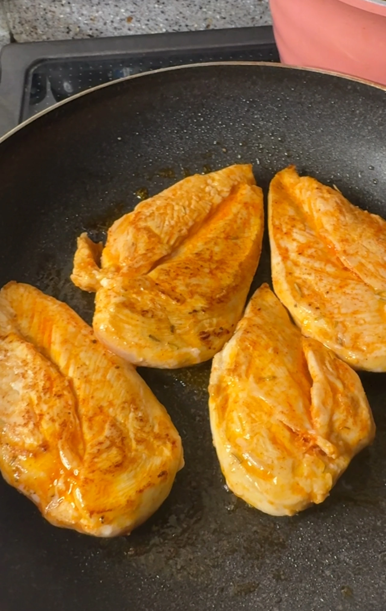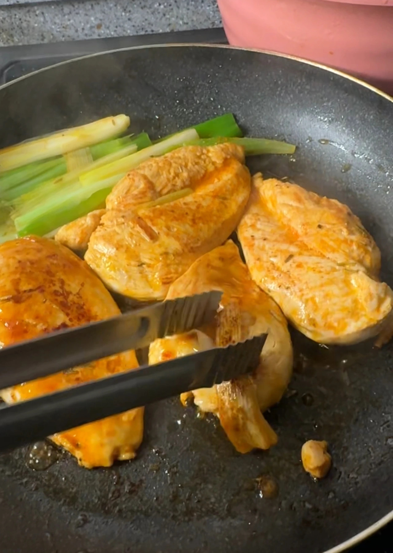 팬을 충분히 달군 뒤 기름을 두르고 닭가슴살을 올려줍니다.