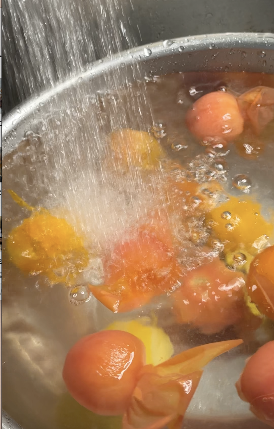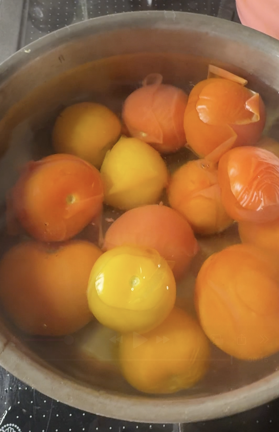 끓는 물에 30초 정도 데치면 칼집을 낸 부분부터 껍질이 쉽게 벗겨집니다.