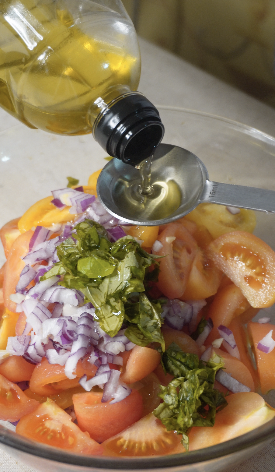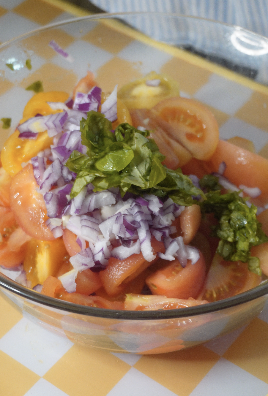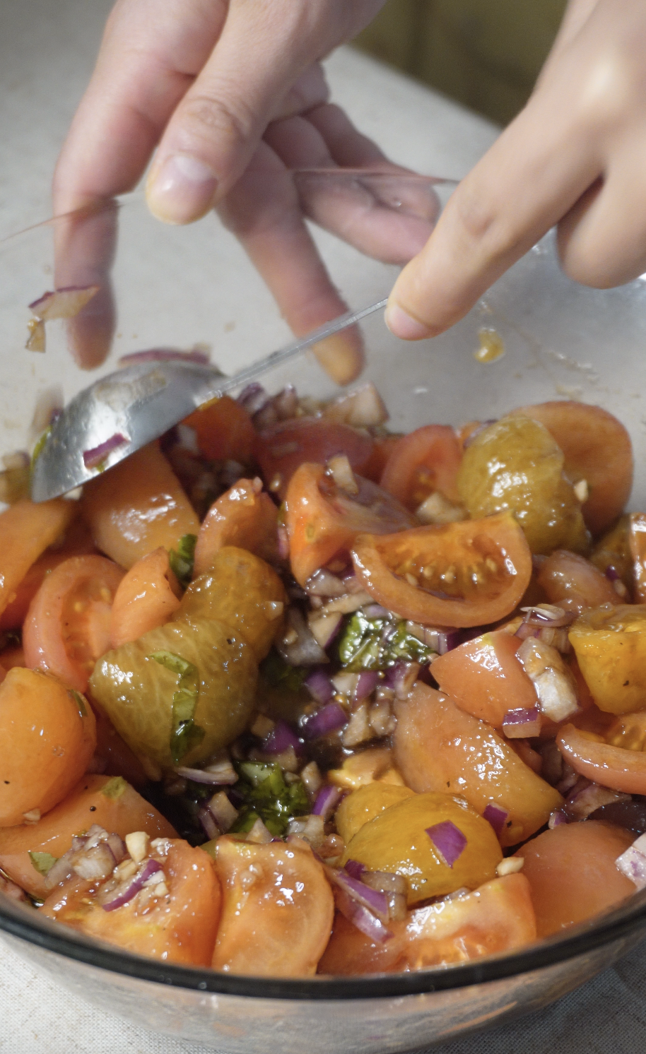신선한 토마토에 올리브오일, 산미(식초나 레몬), 허브를 더해 재워두는 방식은 재료 본연의 맛을 살려줘요 :>