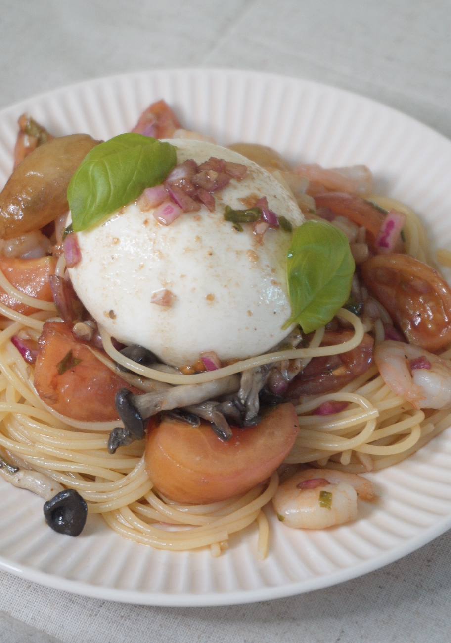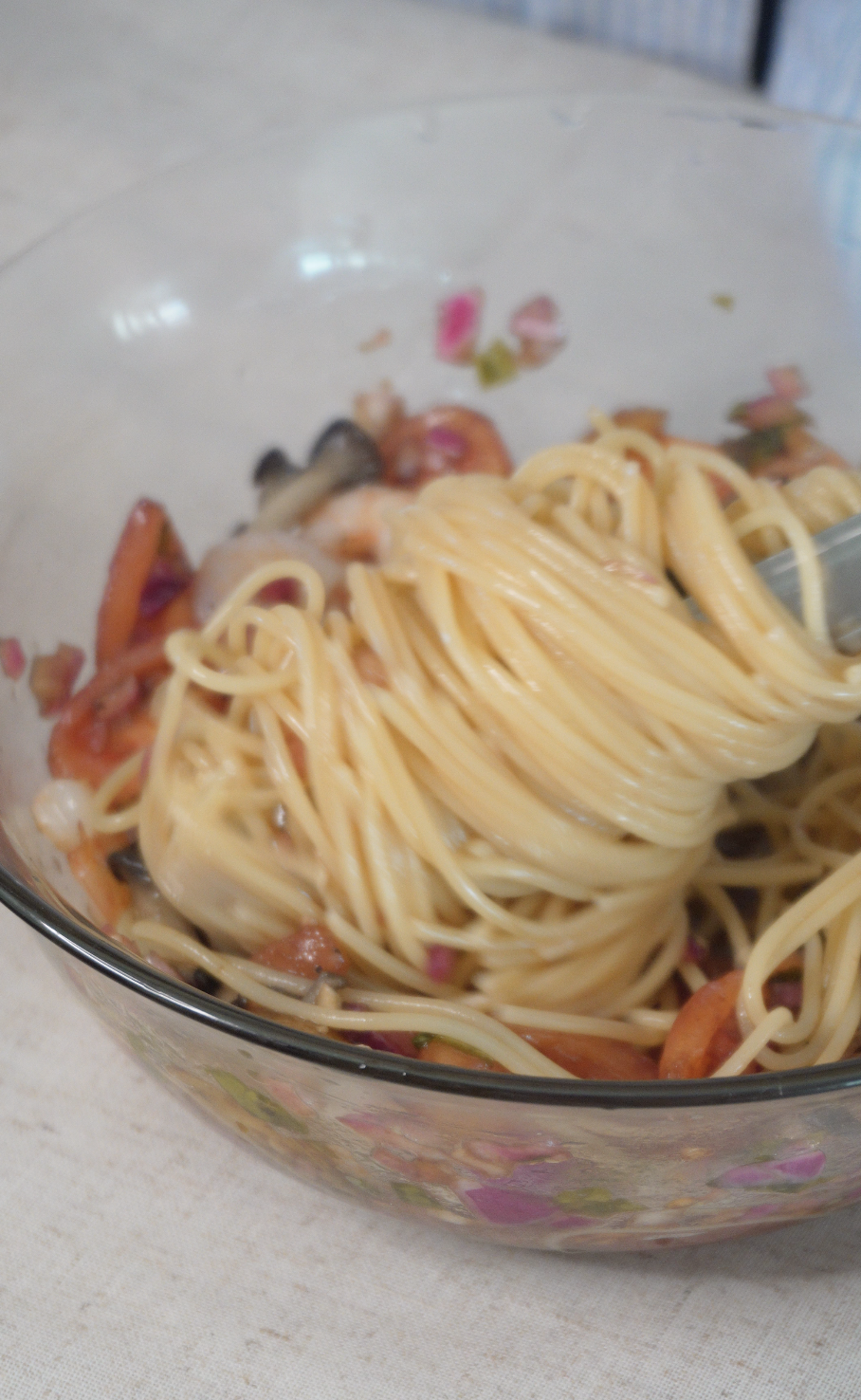 파스타 면에 잘 숙성된 토마토 마리네이드와 구운 새우, 버섯을 넣고 잘 섞어주면 완성입니다.