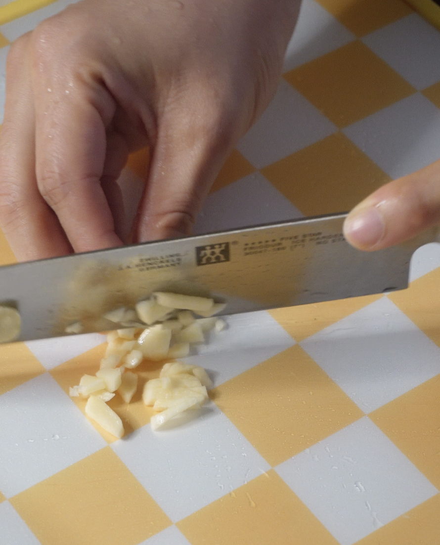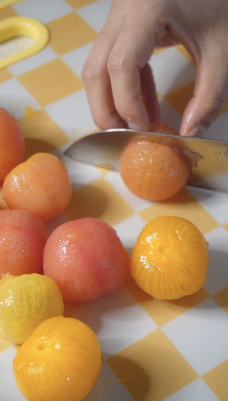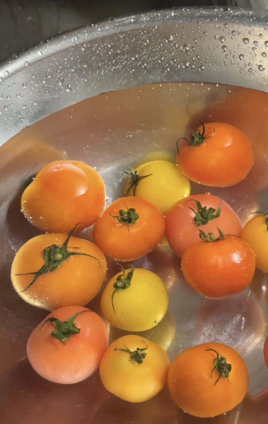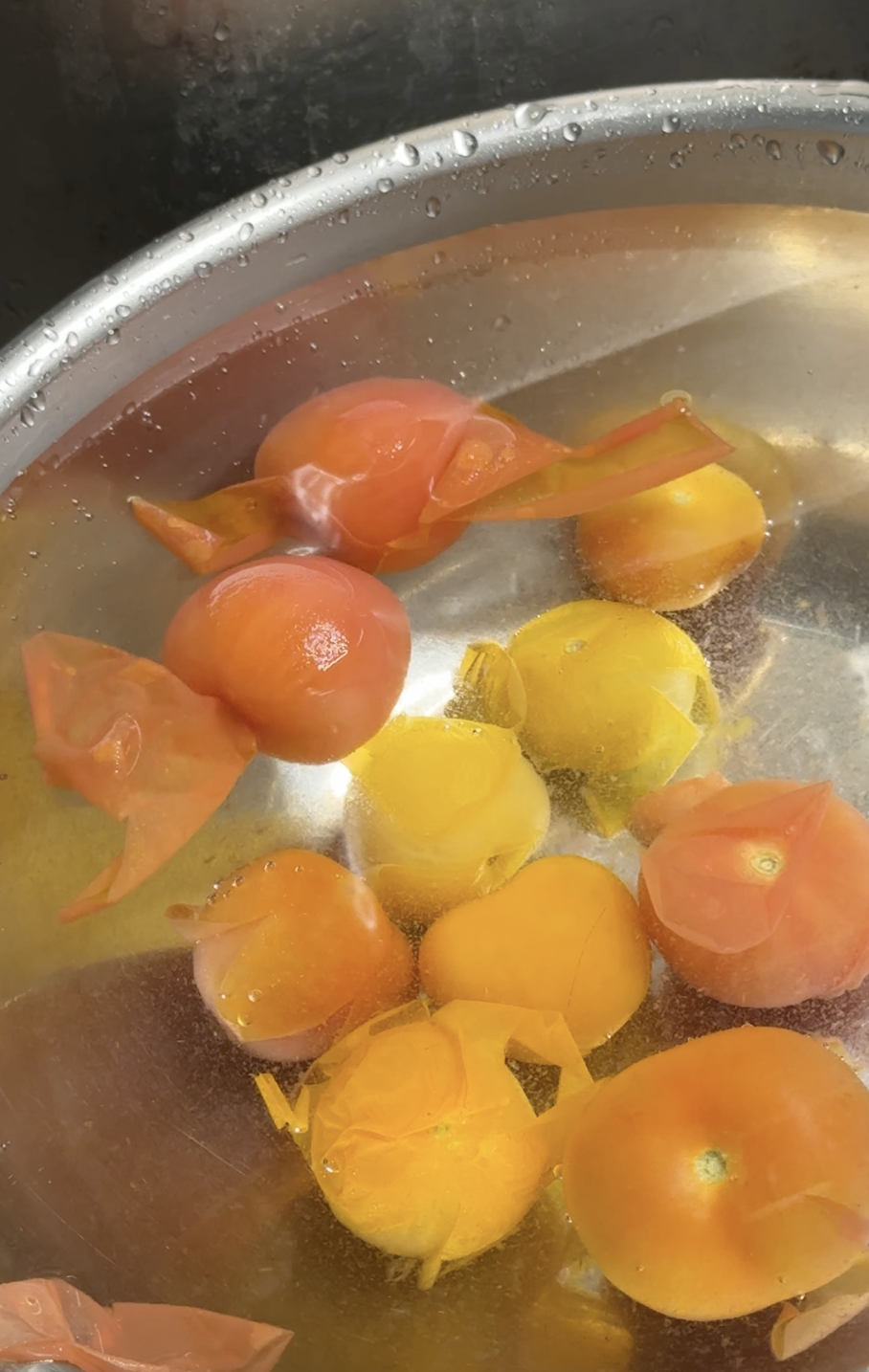 먼저 토마토 뒷면에 십자 칼집을 살짝 내줄게요.